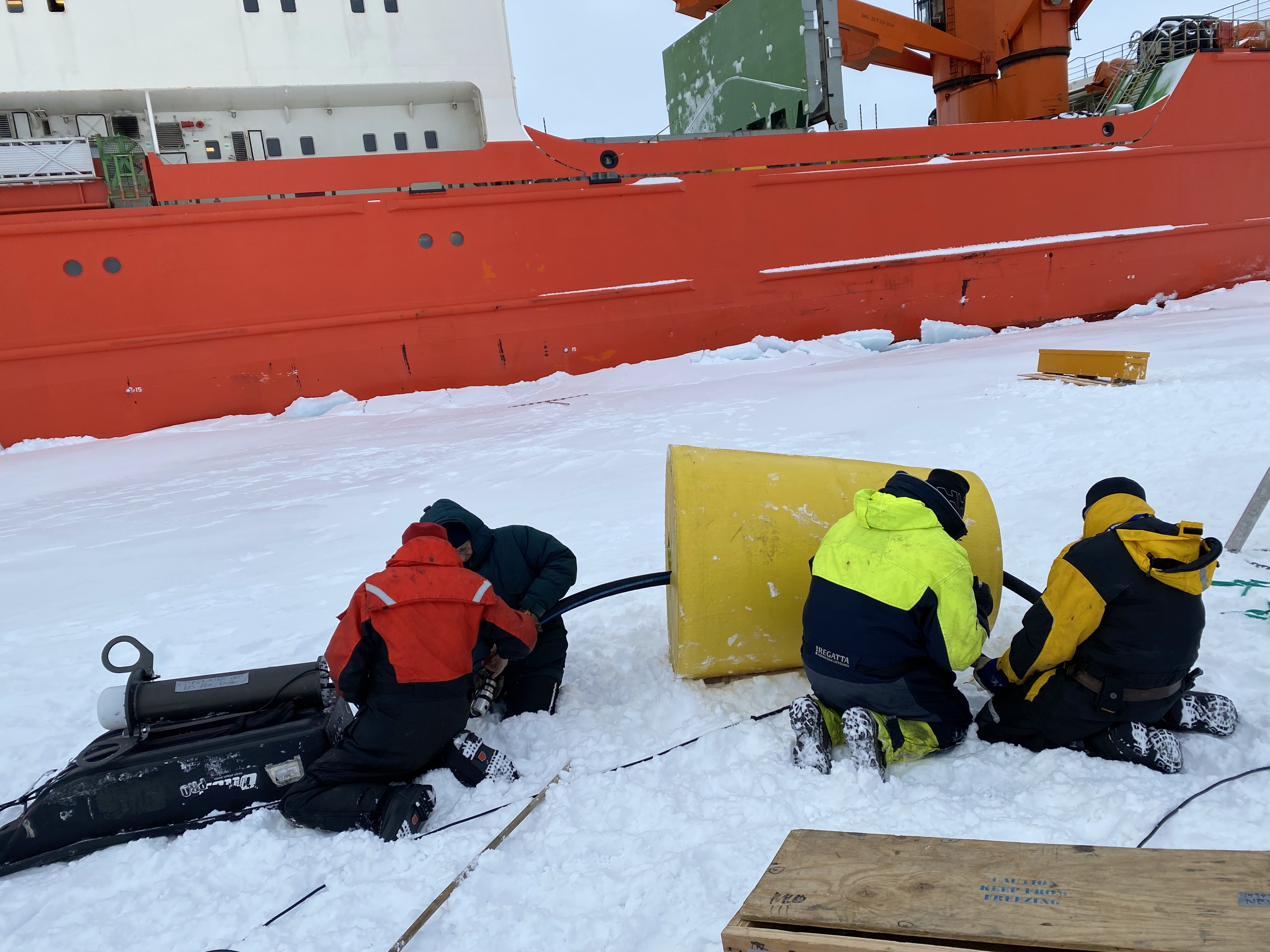 AARI (Arctic and Antarctic Research Institute), WHOI (Woods Hole Oceanographic Institution), and UAF (University of Alaska Fairbanks) scientists connect the float to the ITP (Ice-Tethered Profiler). On the sea ice of the East Siberian Sea near the Akademik Tryoshnikov.