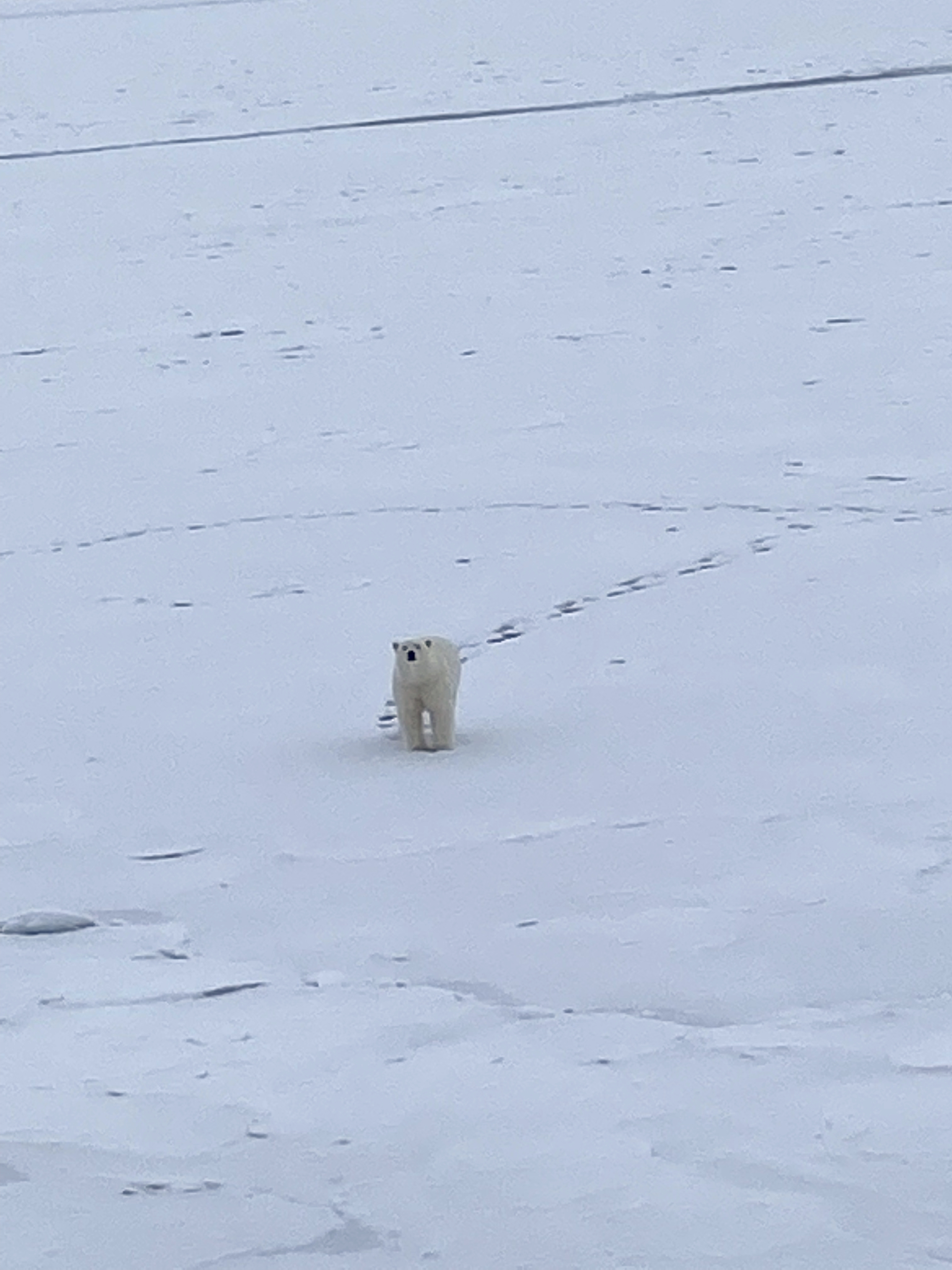 A male polar bear sniffs the air on the sea ice. Aboard the Akademik Tryoshnikov in the East Siberian Sea.