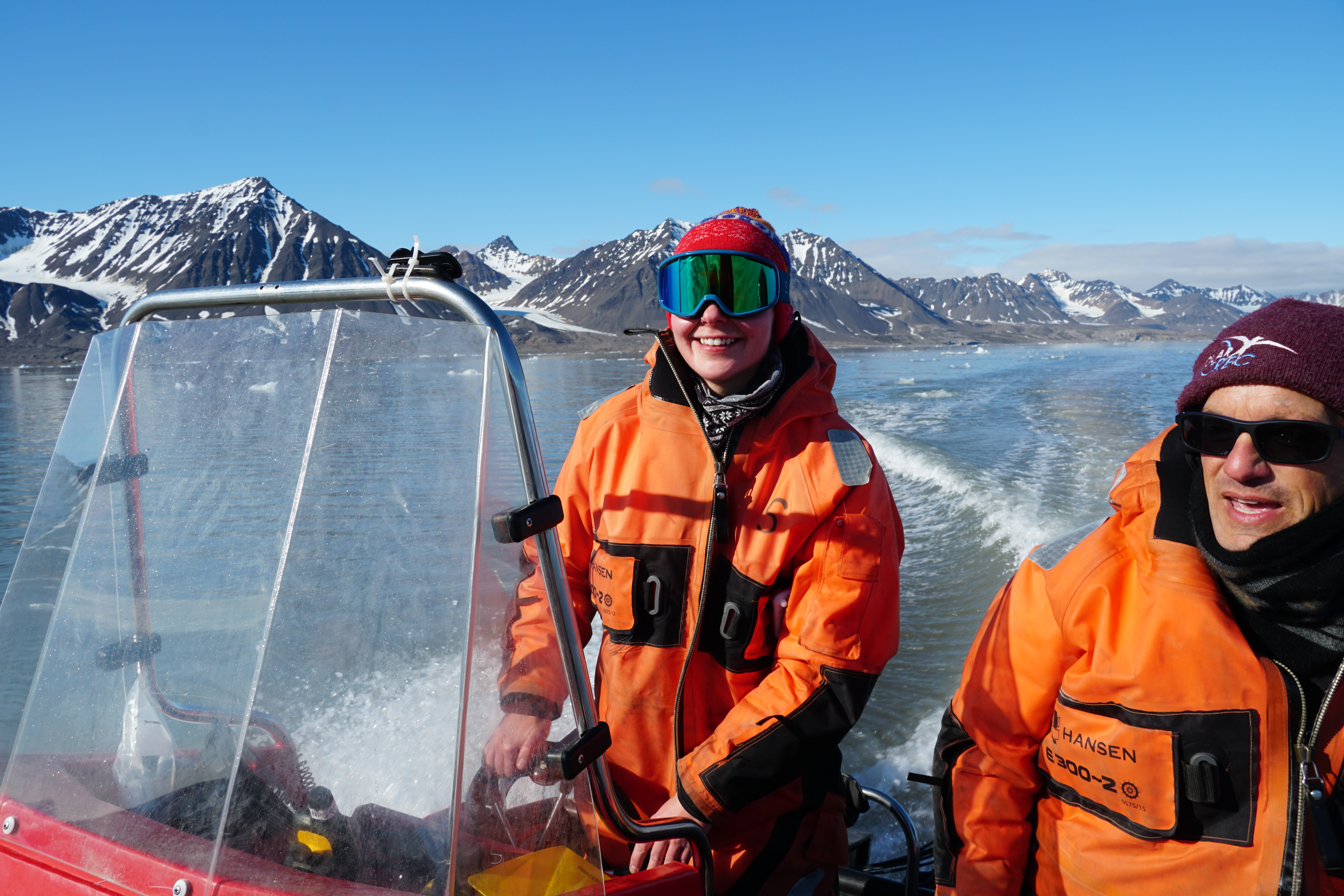 Woods Hole Oceanographic Institution graduate student Kelly McKeon drives the boat for the team. Ny Ă…lesund, Svalbard, Norway.