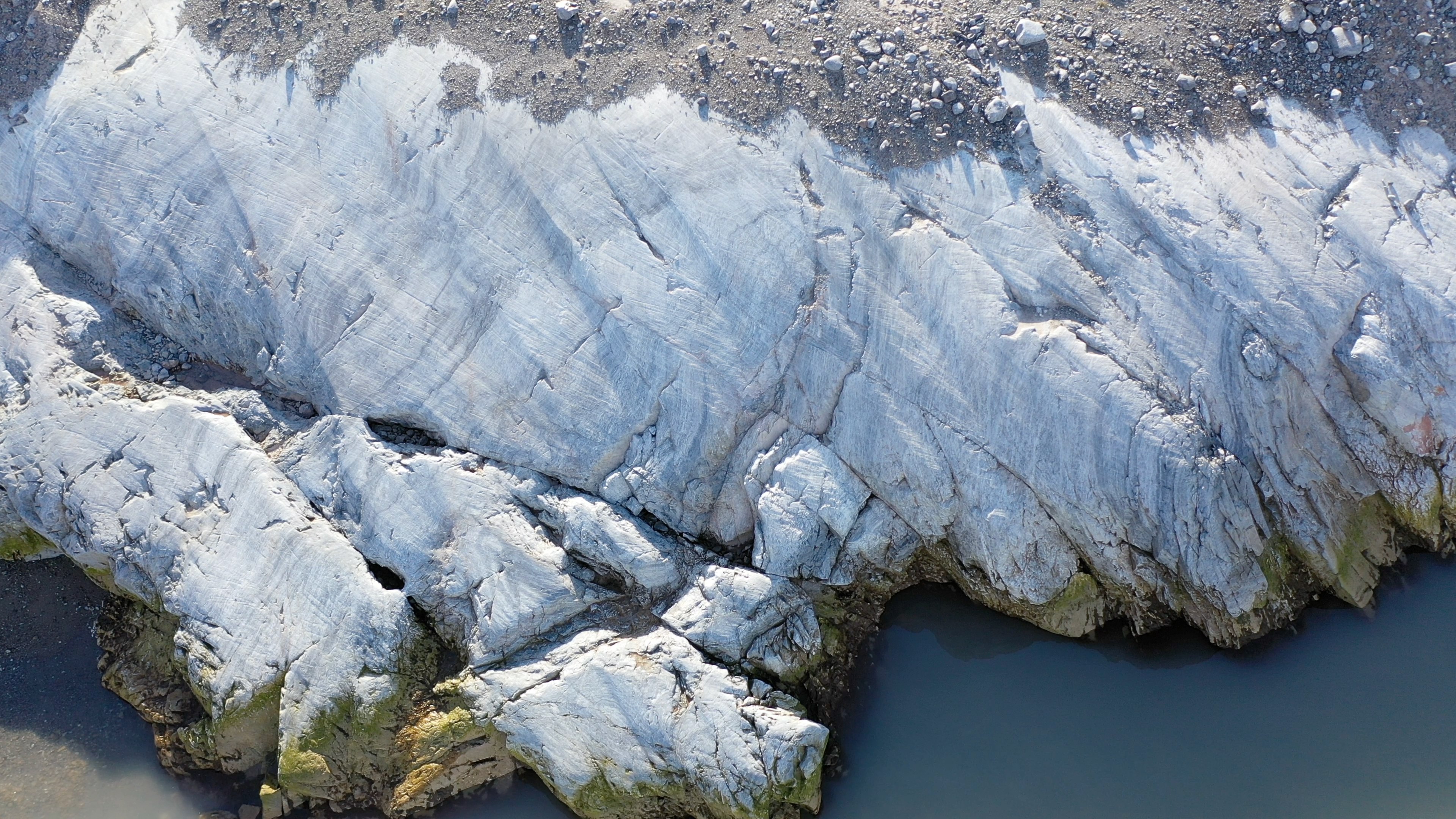 A view from the team's drone looking at glacial scarring on recently deglaciated bedrock. Ny Ă…lesund, Svalbard, Norway.