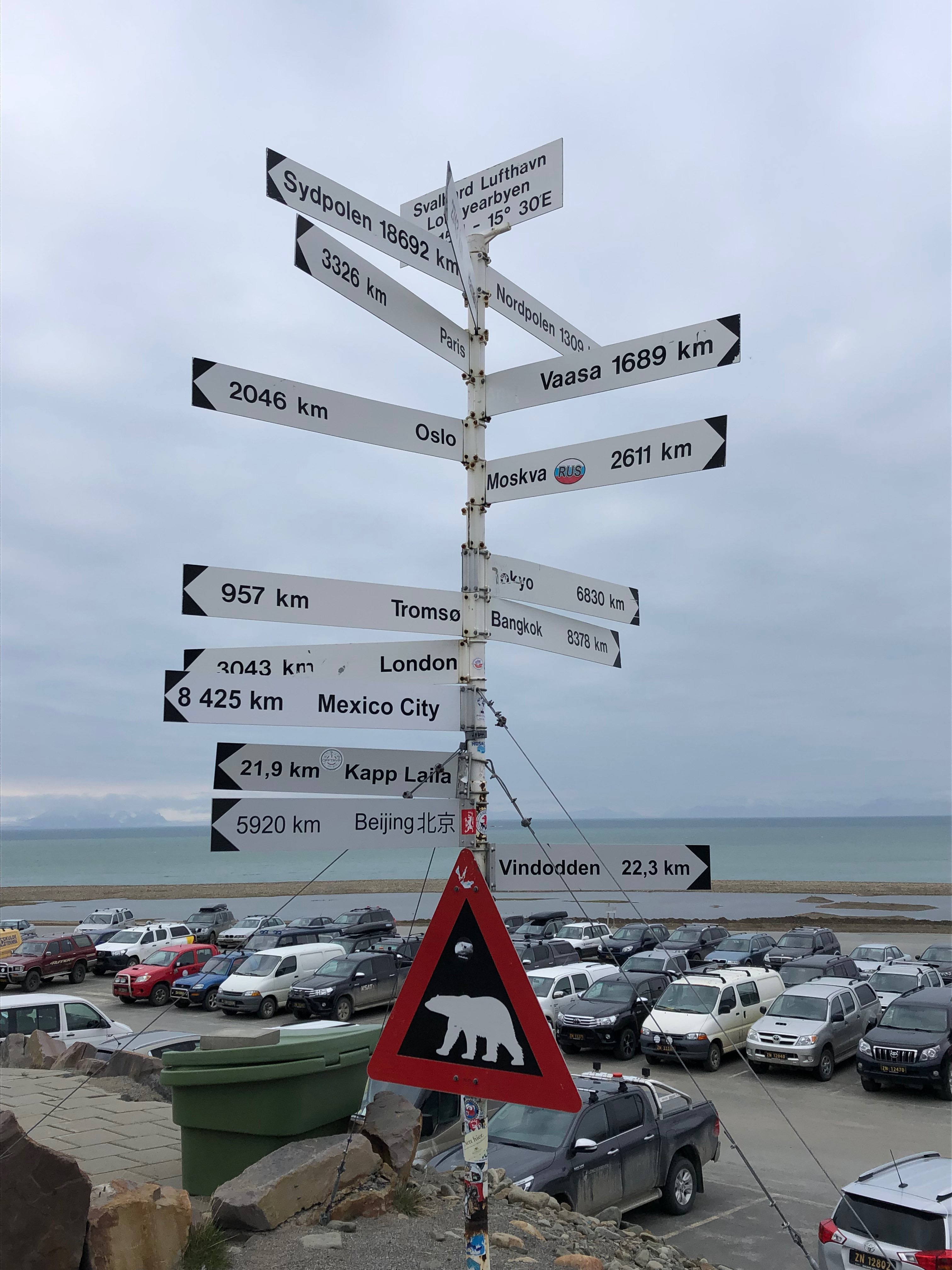 A sign at the Longyearbyen airport shows how far various places around the world are from there. Note that the North Pole (Nordpolen in Norwegian) is only 1309 km away. Longyearbyen, Norway.