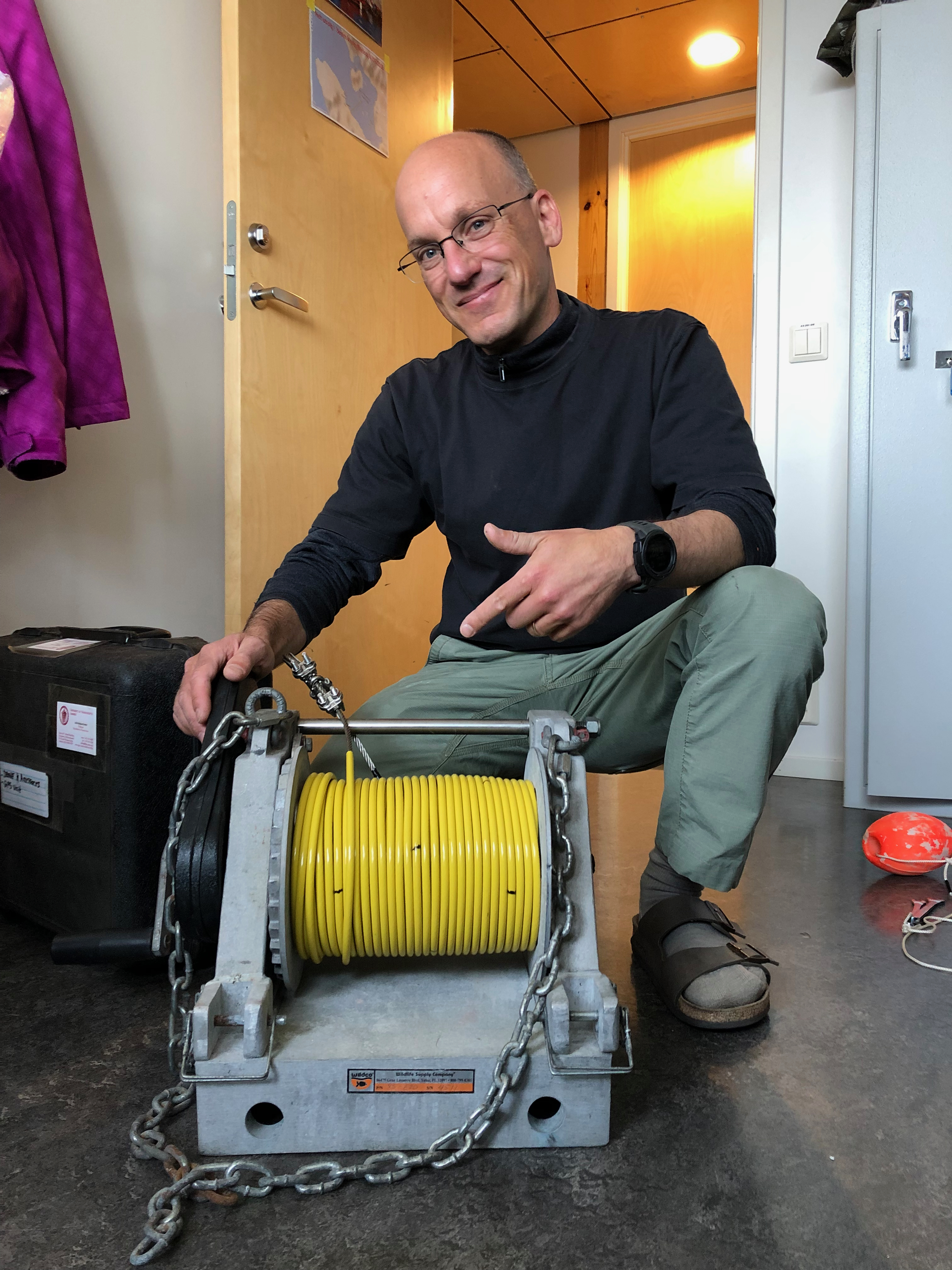 Mark Goldner with a brand new cable on the winch that the team will use for the CTD (Conductivity, Temperature, and Depth instrument) and water sampling. Ny Ă…lesund, Svalbard, Norway.