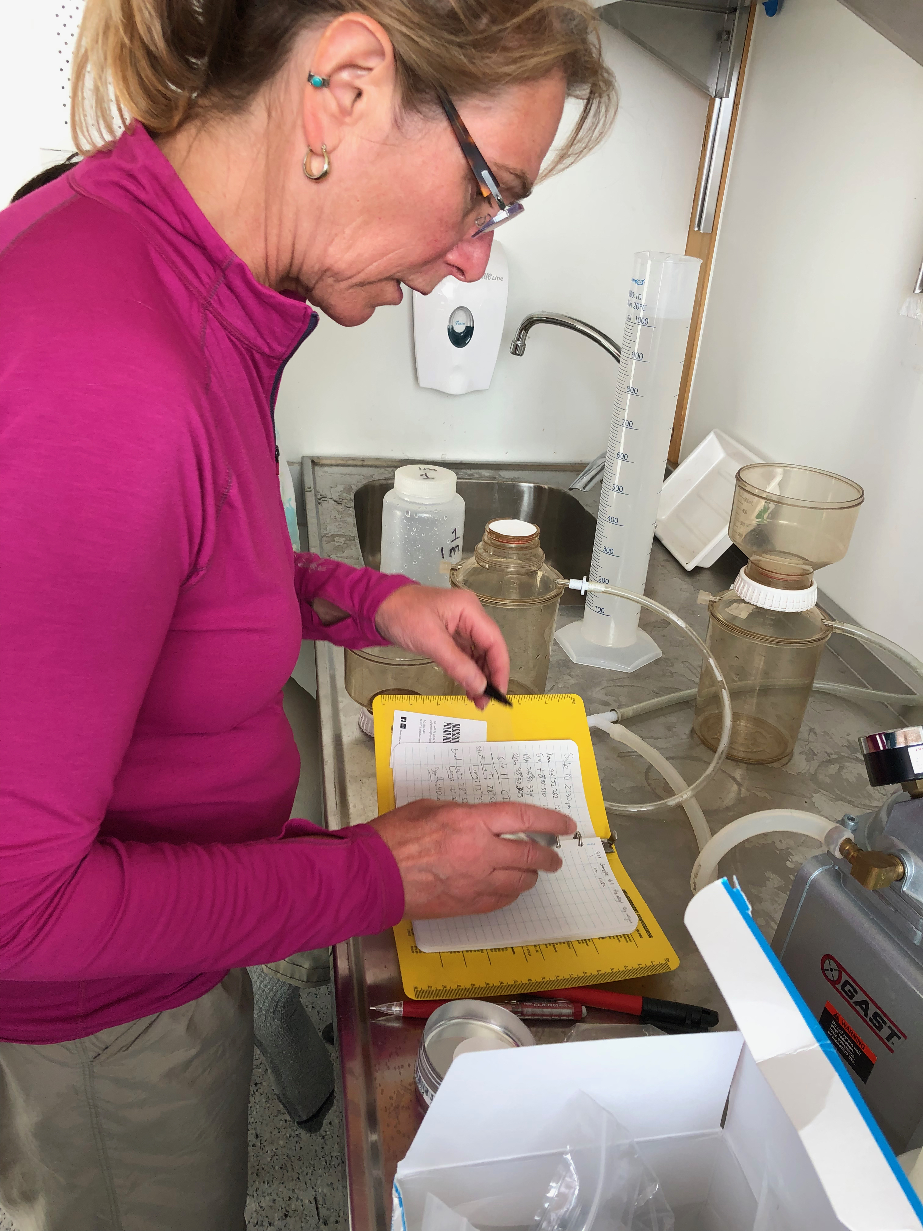 Julie Brigham-Grette instructs the rest of the team in the proper method for filtering water for turbidity calibration. Ny Ă…lesund, Svalbard, Norway.