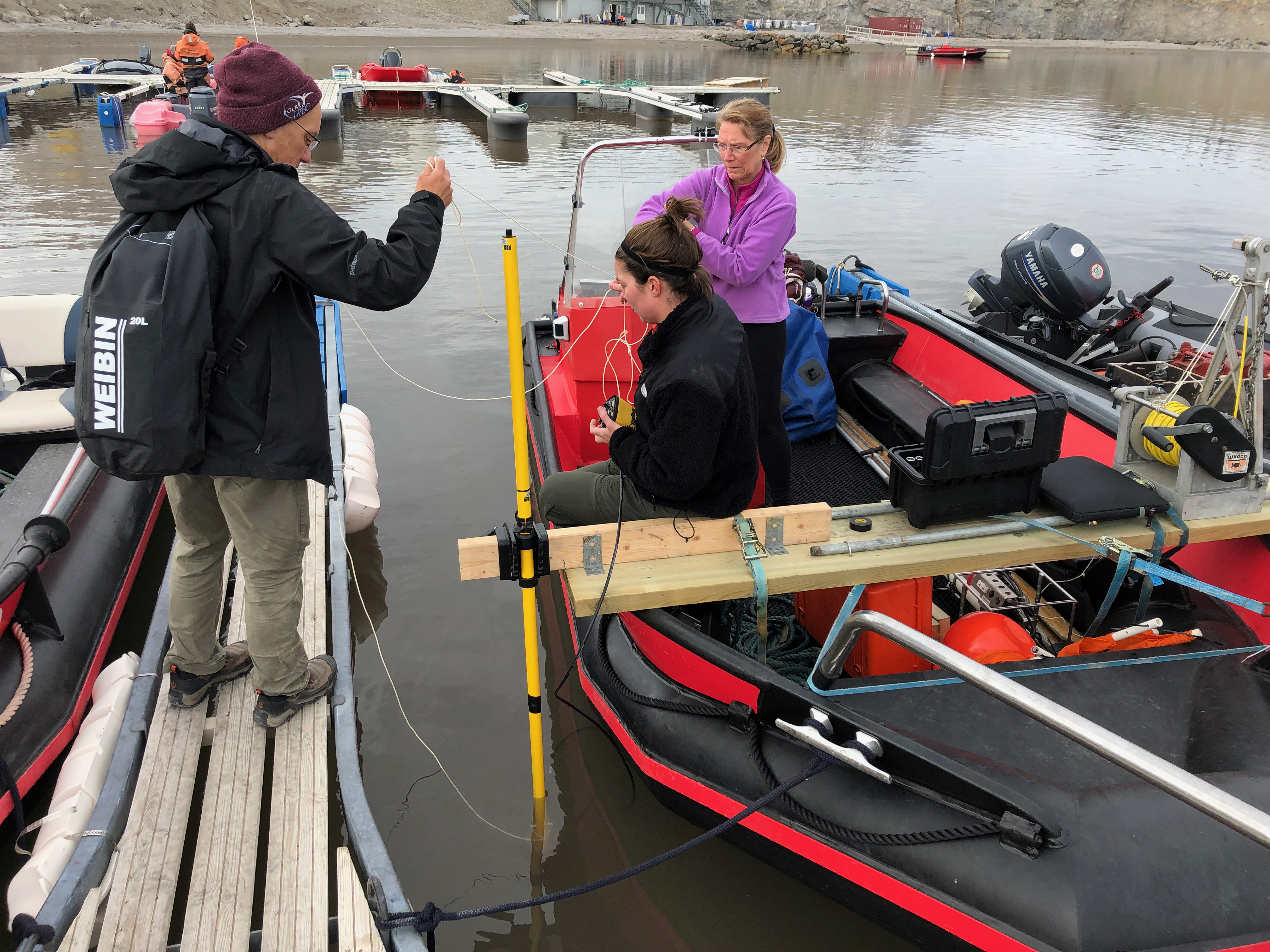 Kelly McKeon sets up the bathymetry equipment on the team's boat. Ny Ă…lesund, Svalbard, Norway.