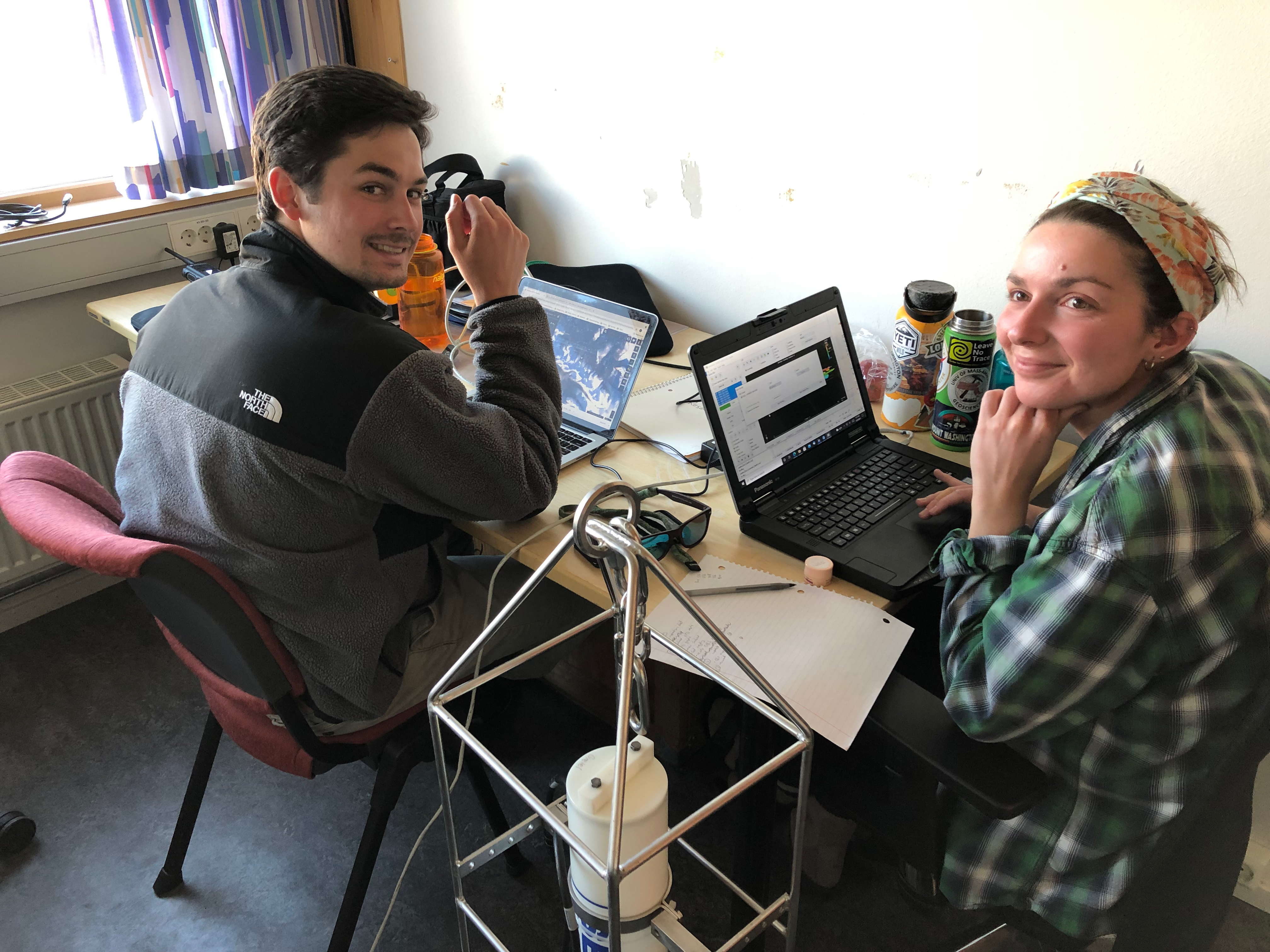 Xander Kirshen and Kelly McKeon work indoors on the team's 'office day'. Ny Ă…lesund, Svalbard, Norway.