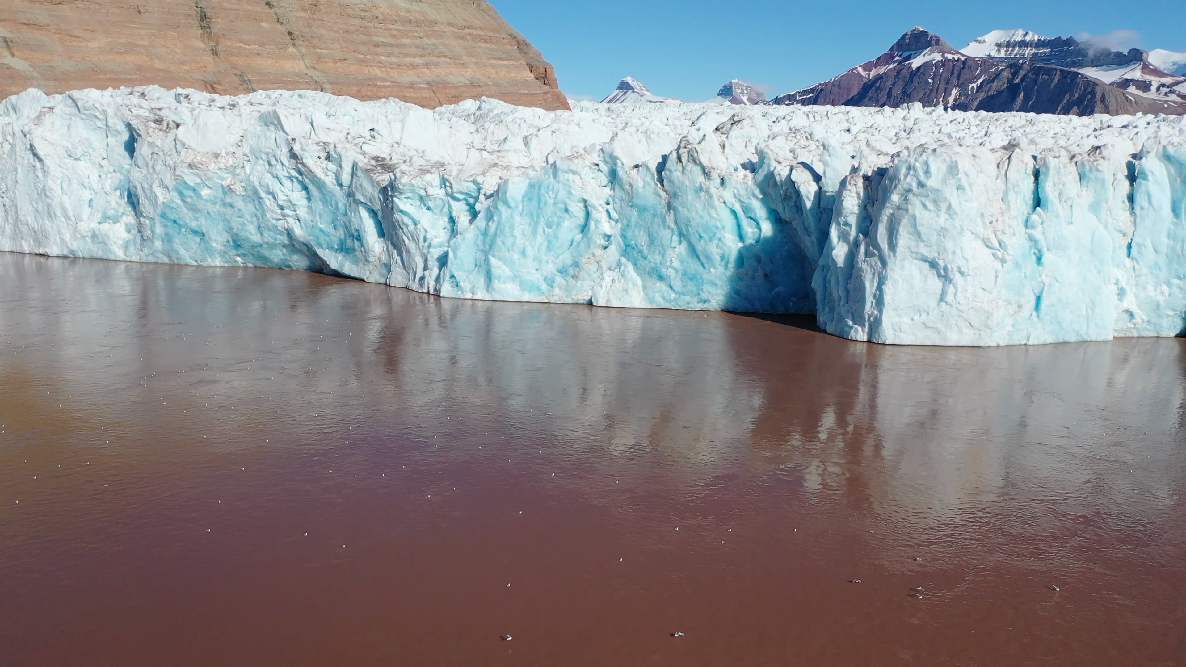 The brown water in front of Kongsvegen Glacier is caused by the large amount of sediment flowing out. Ny Ă…lesund, Svalbard, Norway.