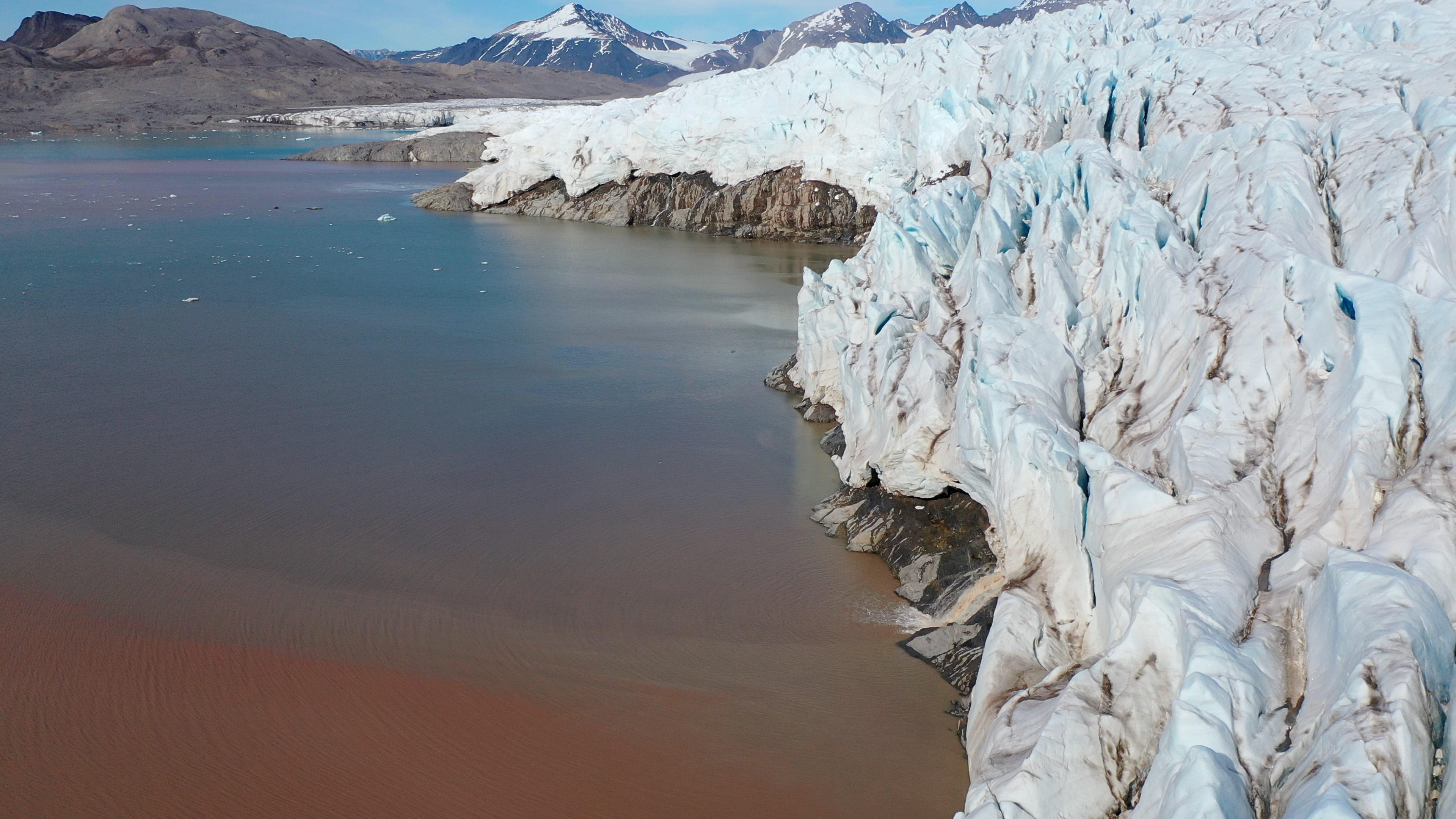 The ice margin of Kongsbreen Glacier, which has almost entirely retreated out of the ocean. Ny Ă…lesund, Svalbard, Norway.