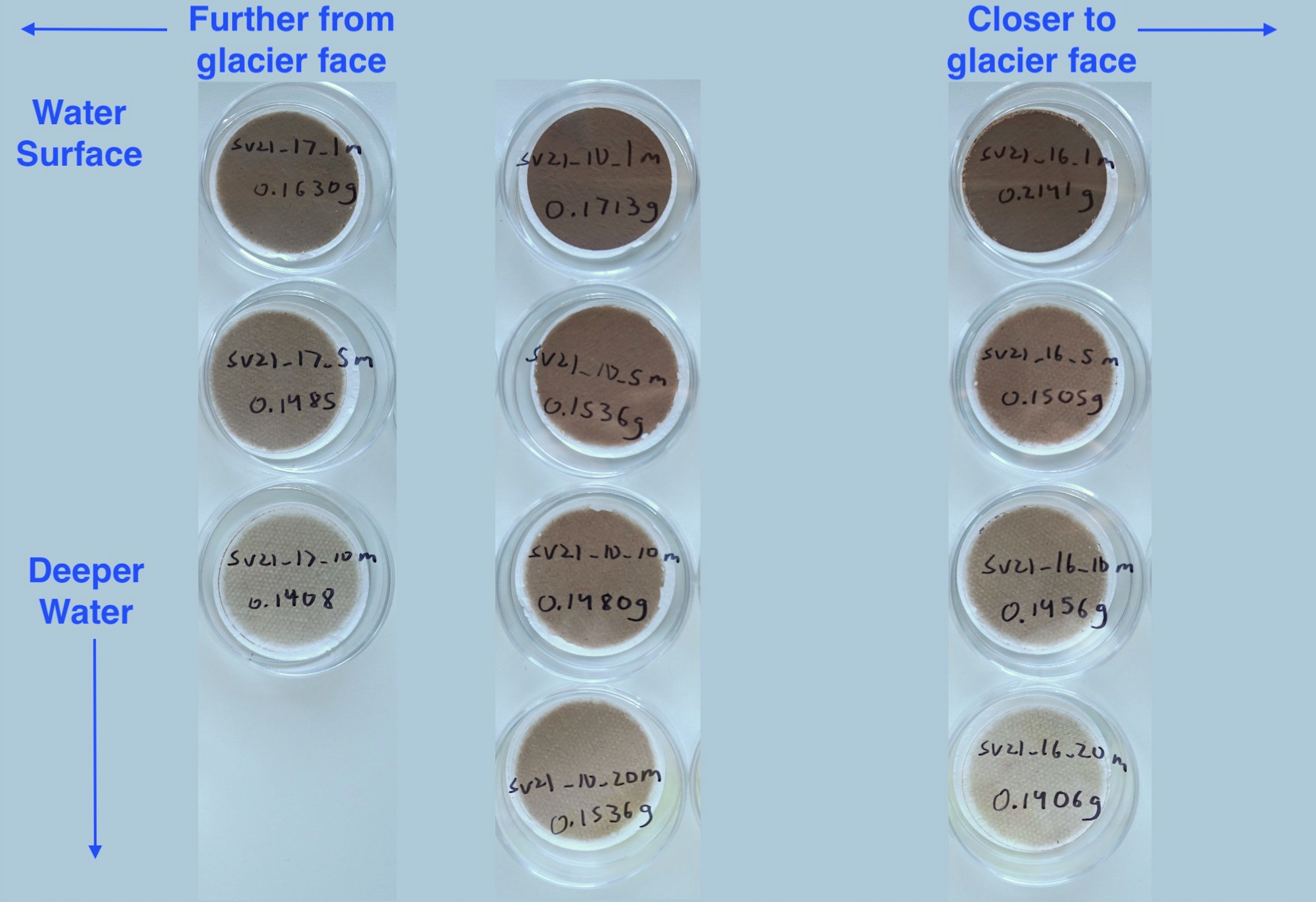 These images are from the water samples that were taken from different distances from the glacier face within a sediment plume, after they were filtered and dried. Basically, the darker the paper, the more sediment is in the water. Ny Ă…lesund, Svalbard, Norway.