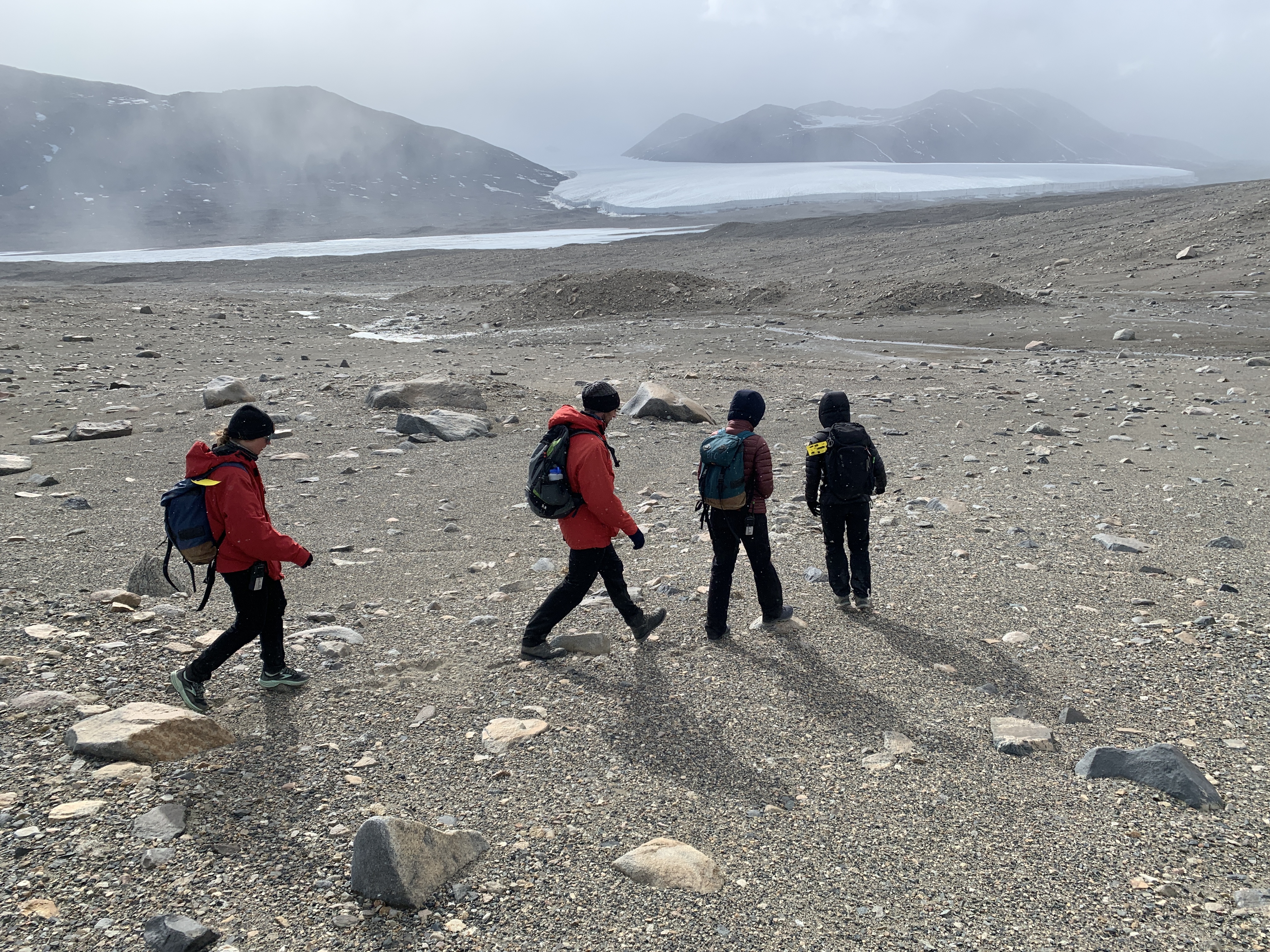 Meredith Snyder, Jesse Jorna, Abigail Borgmeier, and Sarah Power hike across Taylor Valley, Antarctica to a remote sampling site.