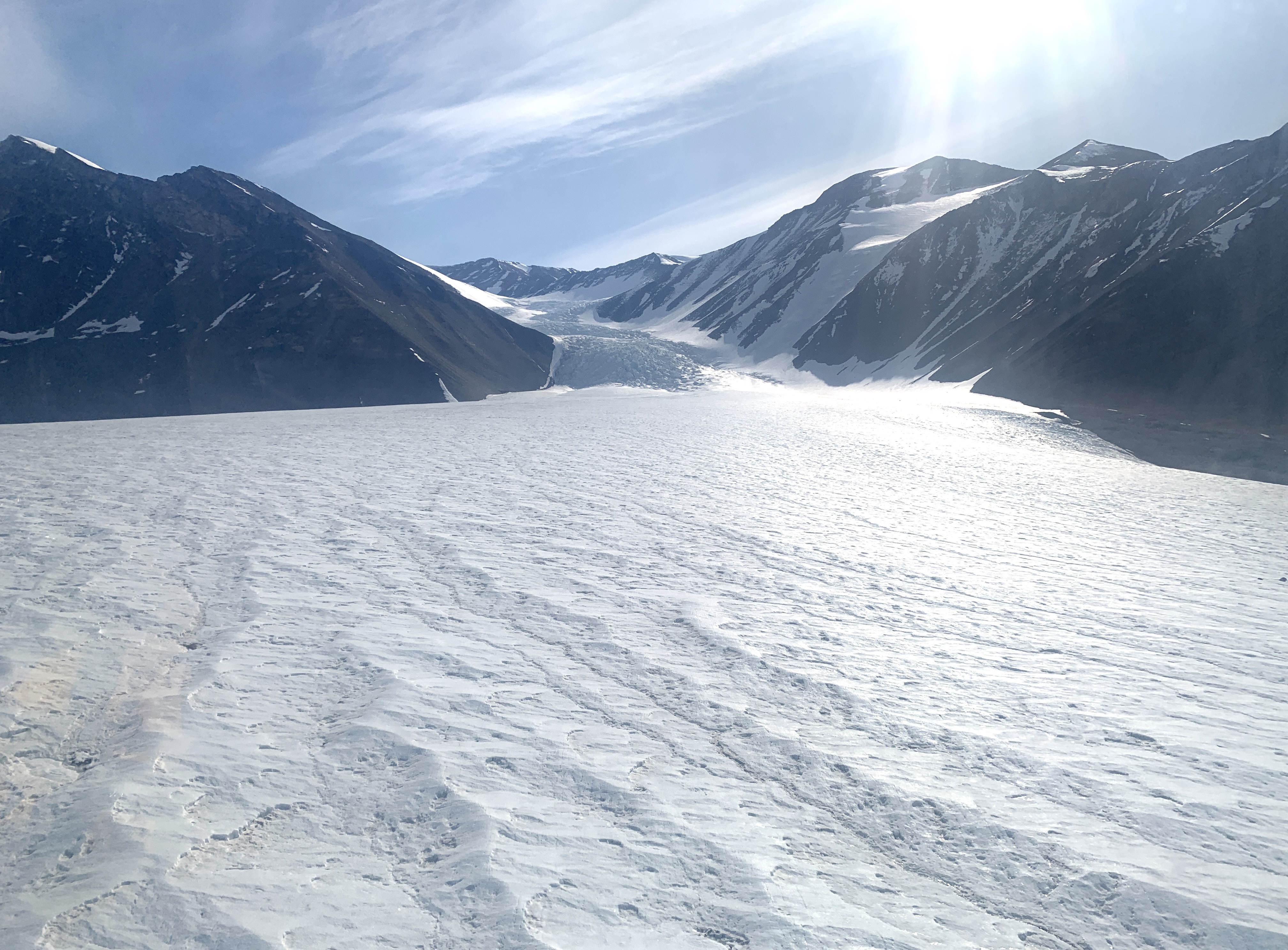 An aerial view of Canada Glacier on the helicopter flight to Beacon Valley, Antarctica.