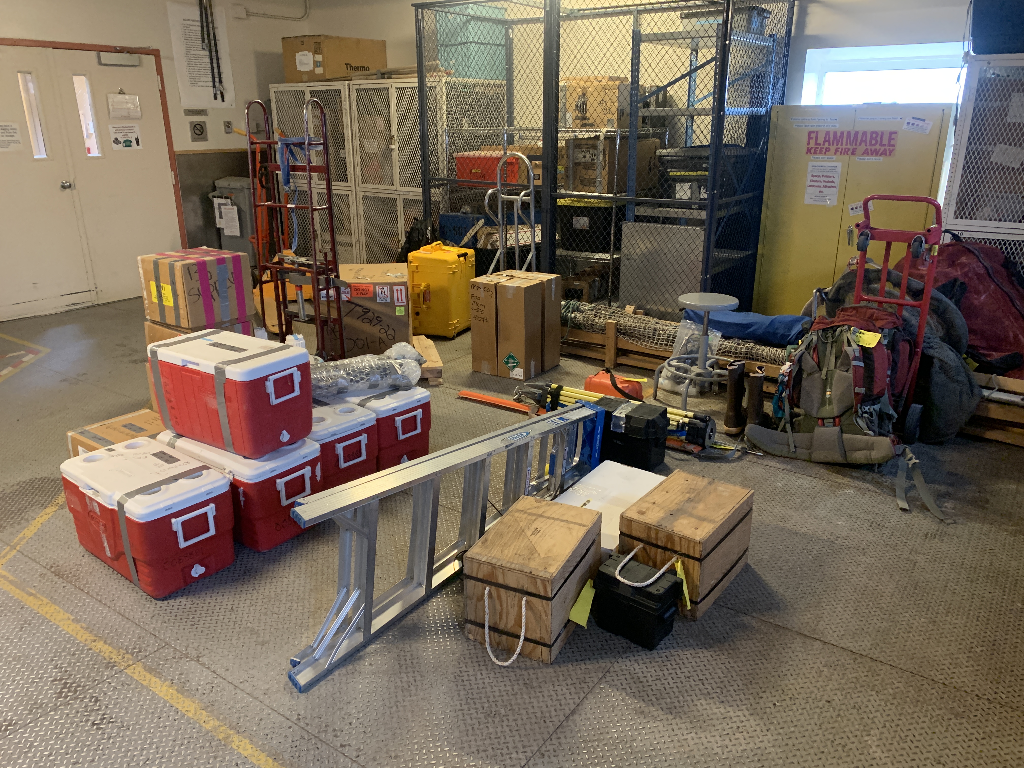 Gear is packed and ready for the first Wormherder field camp of 2023. Cargo is stationed for delivery to field camps in the Berg Field Center at McMurdo Station, Antarctica.