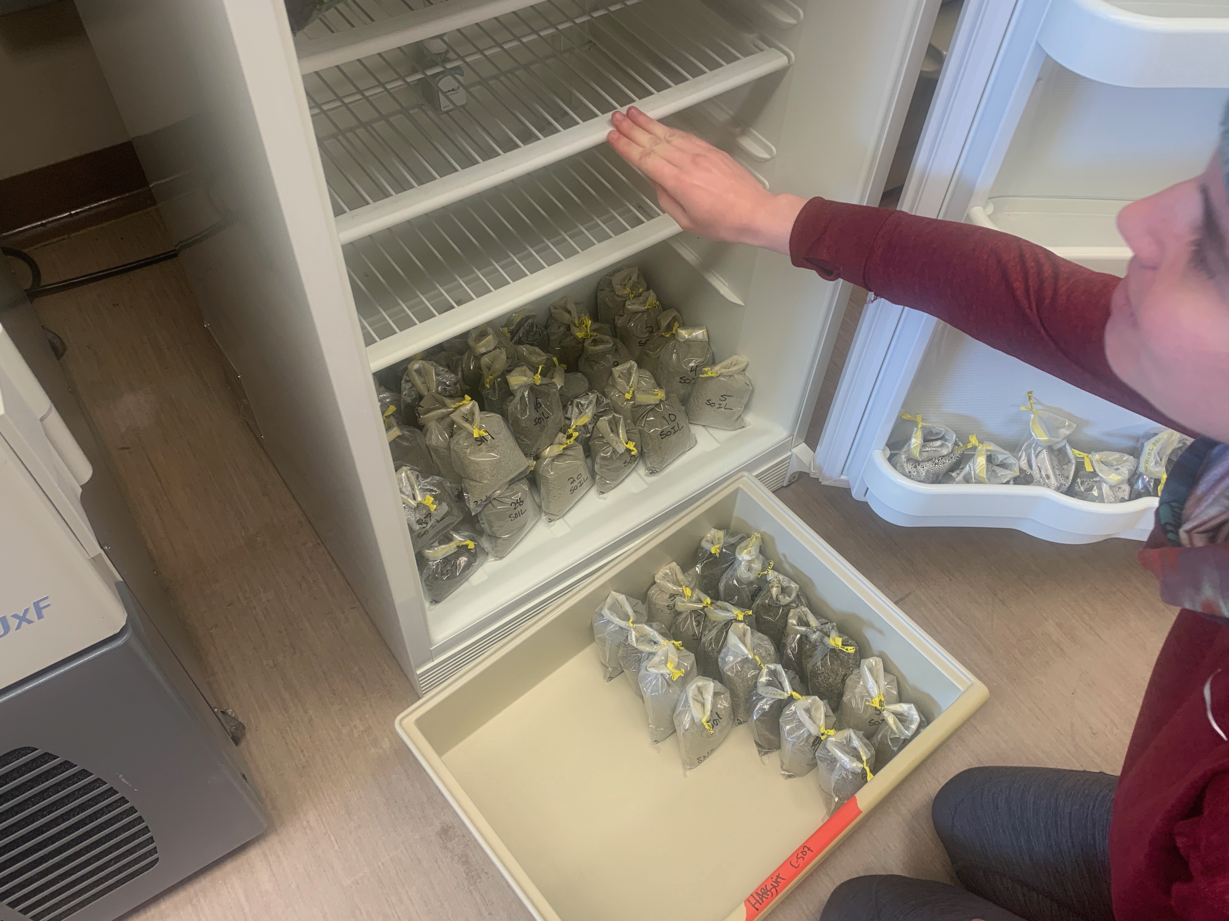 Soil samples from the Dry Valleys are stored in a cold environment before processing. Crary Lab, McMurdo Station, Antarctica.