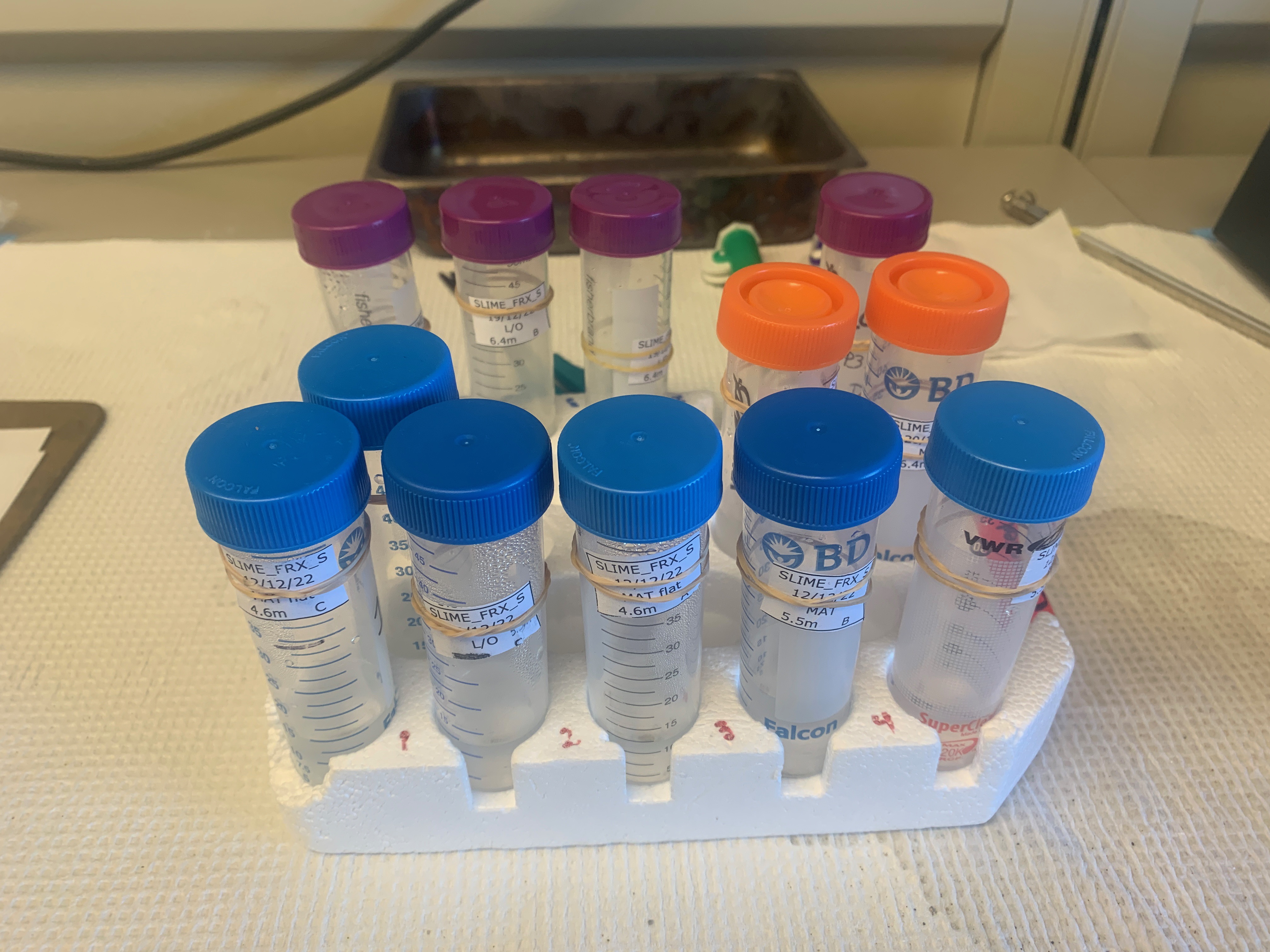 Extracted samples of nematodes are carefully packed and stored for analysis. They must be kept cool at all times. The tubes are labeled with sample site, date, and conditions. Crary Lab, McMurdo Station, Antarctica.