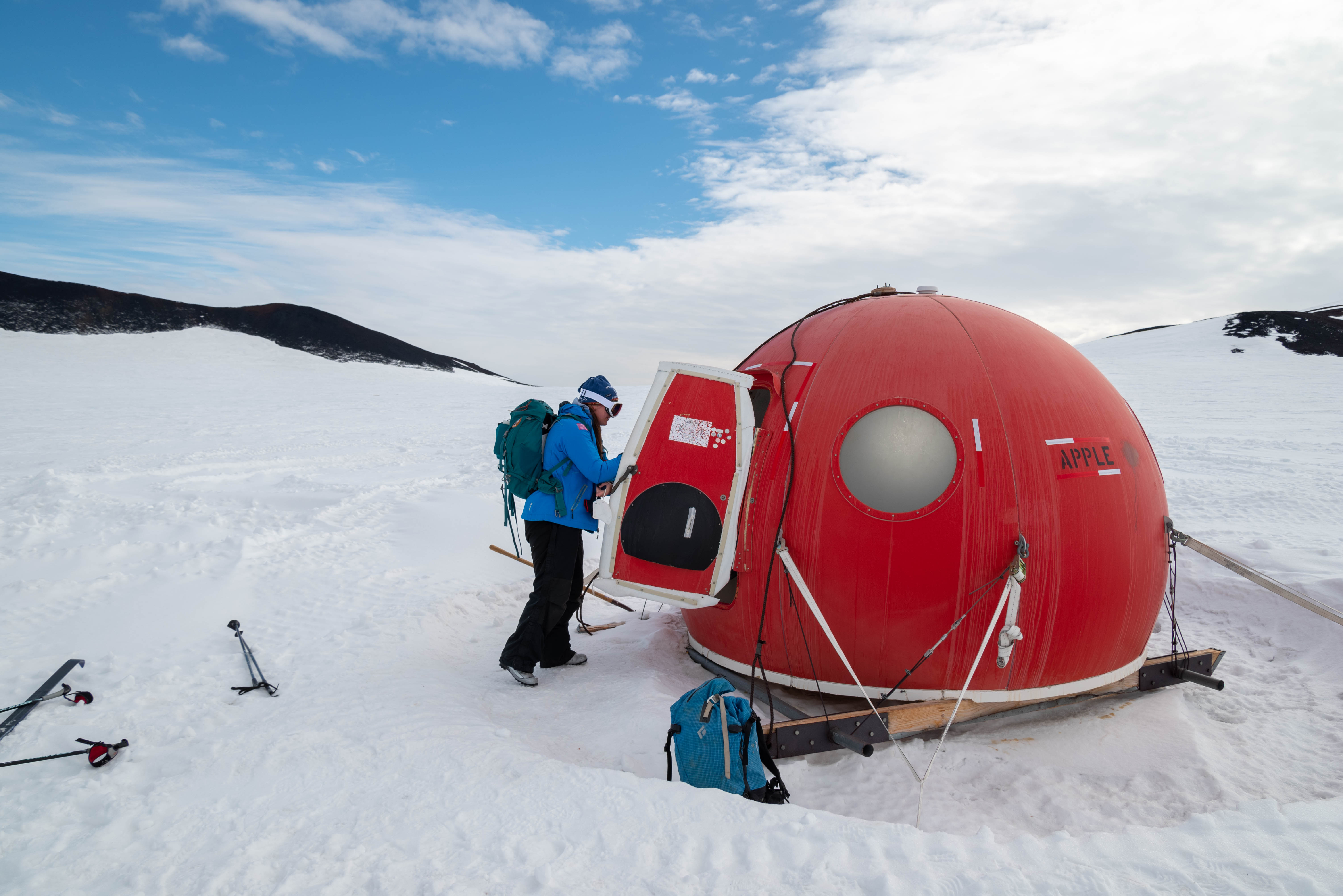 Elaine Krebs enters a survival hut (called "apples") along the Castle Rock Loop Trail near McMurdo Station, Antarctica.