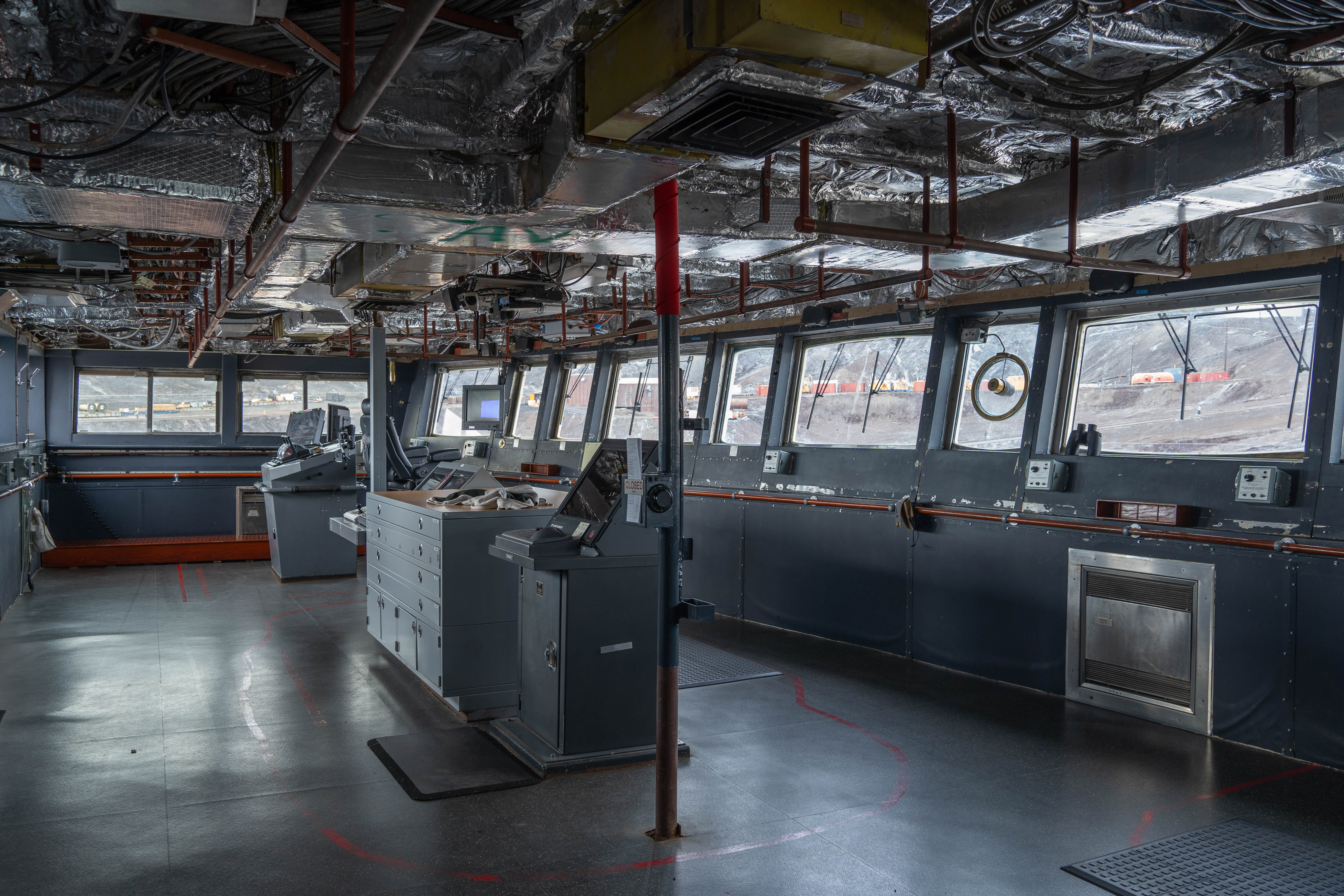 The bridge of the RV Polarstern. At the ice dock at McMurdo Station, Antarctica.