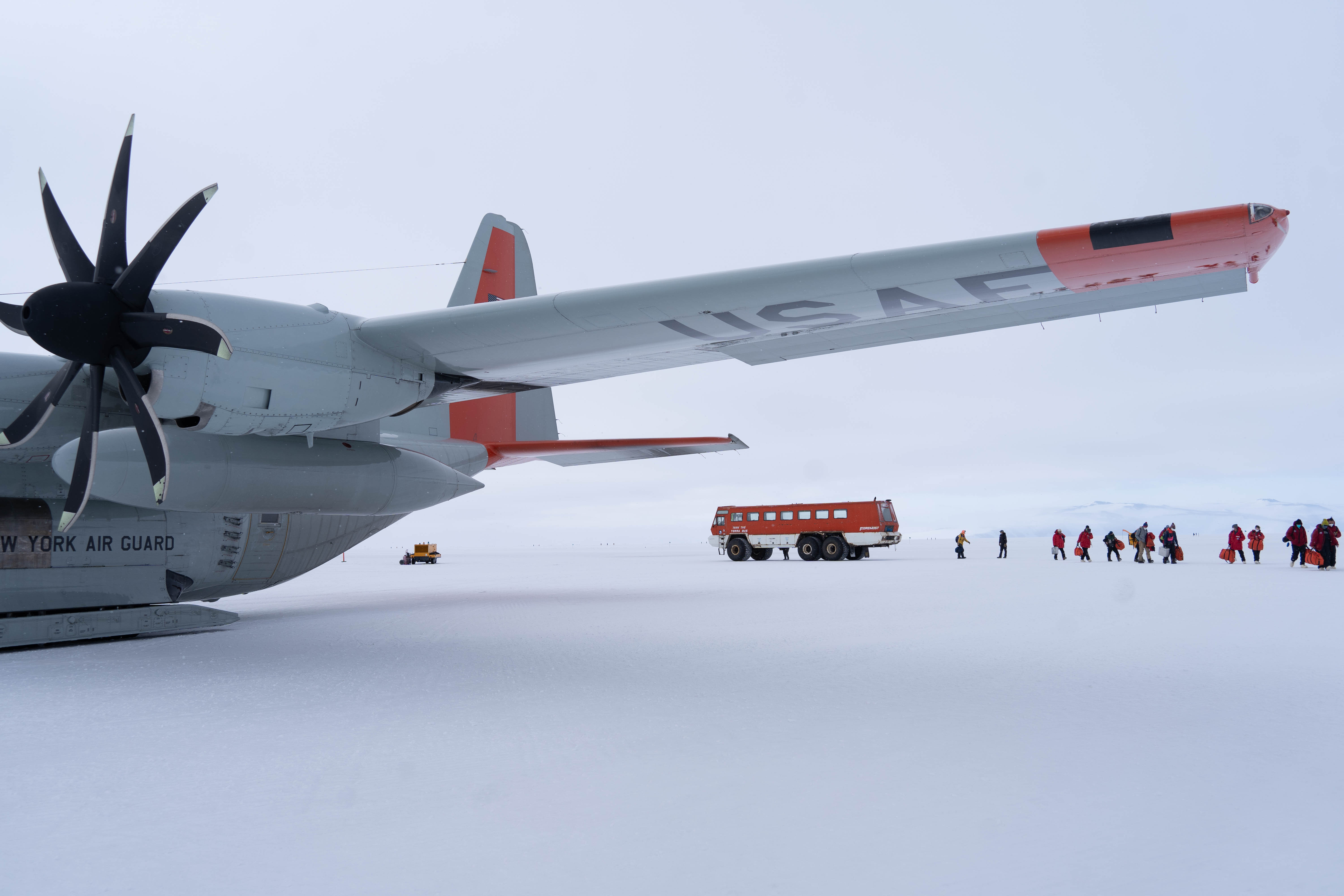Passengers get ready to board beneath the wing of an LC-130 at Williams Field, Antarctica.
