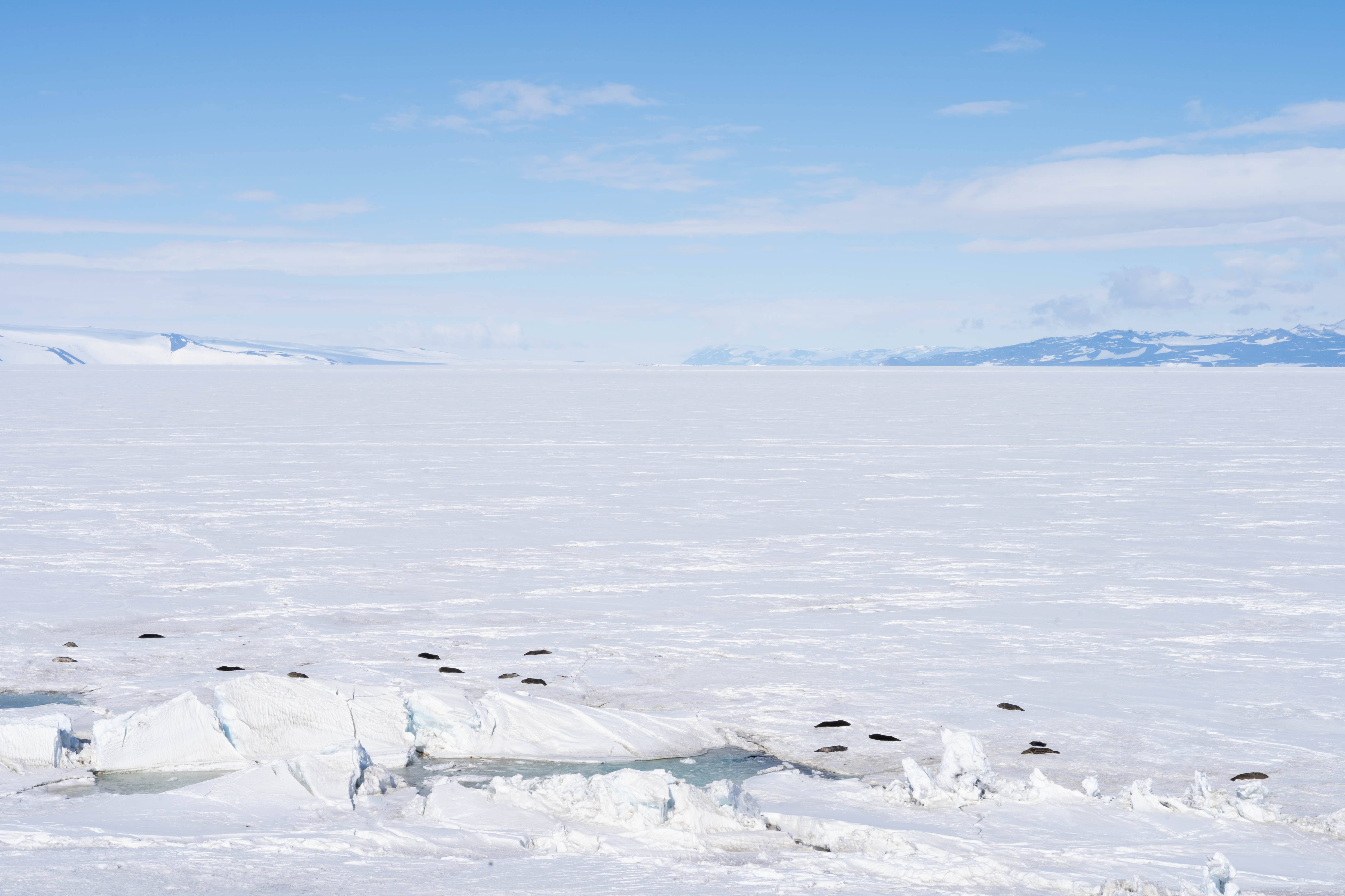 Weddell seals along a pressure ridge in the frozen Ross Sea. Observation Hill, McMurdo Station, Antarctica.