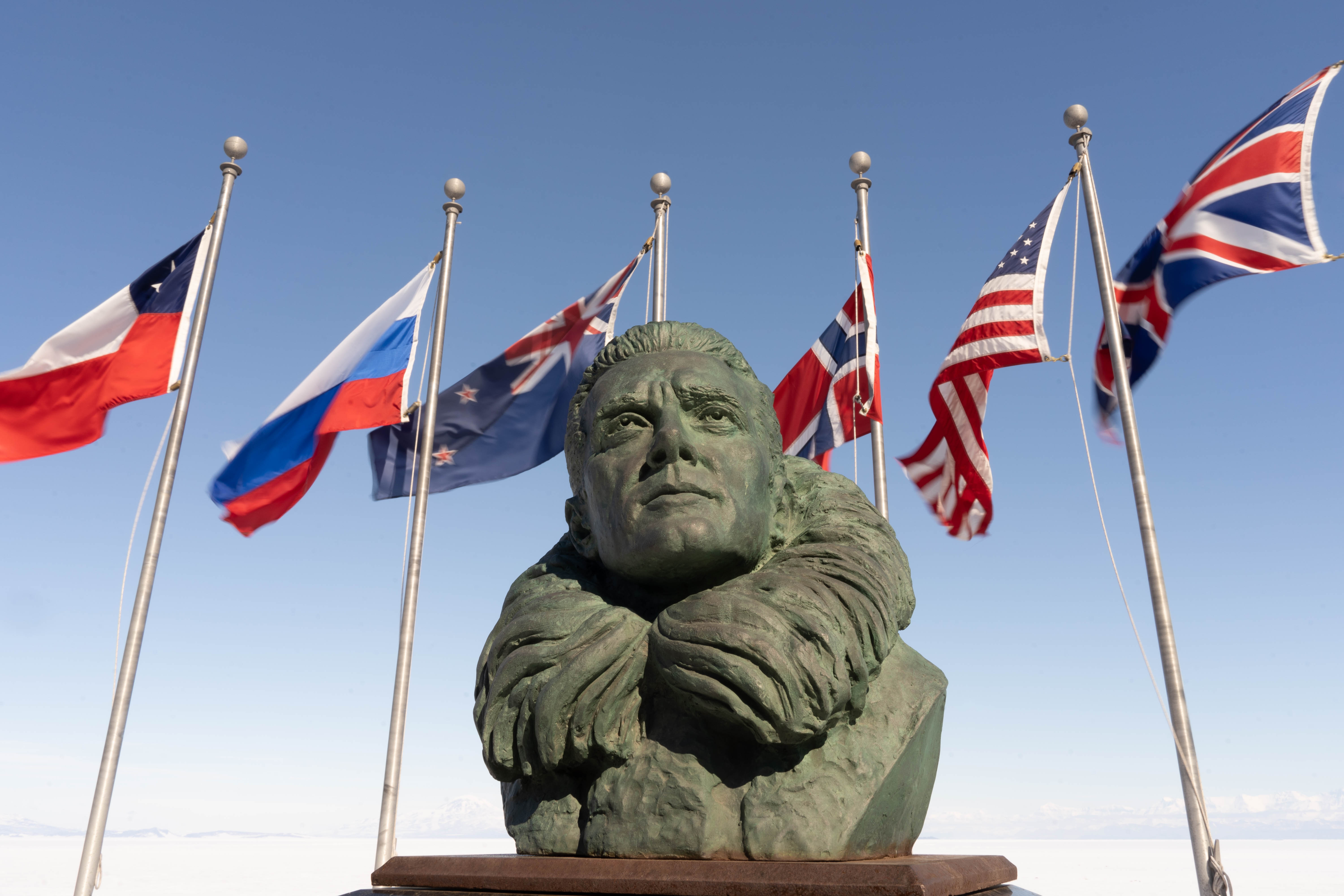 A statue of famed Antarctic pilot Richard E. Byrd sits in front of the twelve flags of the countries that signed the Antarctic Treaty in 1959. McMurdo Station, Antarctica.