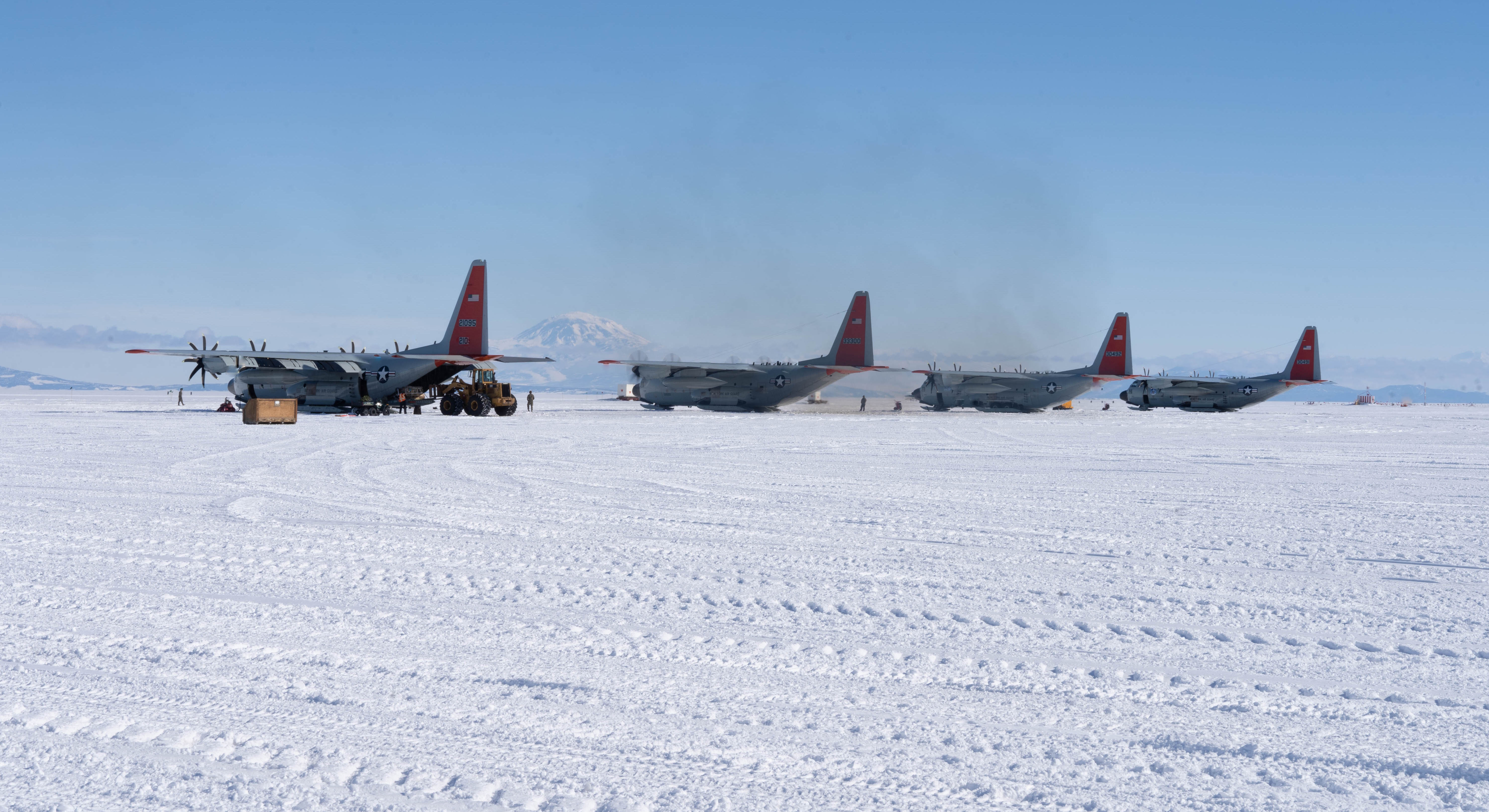 Four LC-130 planes lined up at Williams Field wait for assignment or repairs. Williams Field, Antarctica.