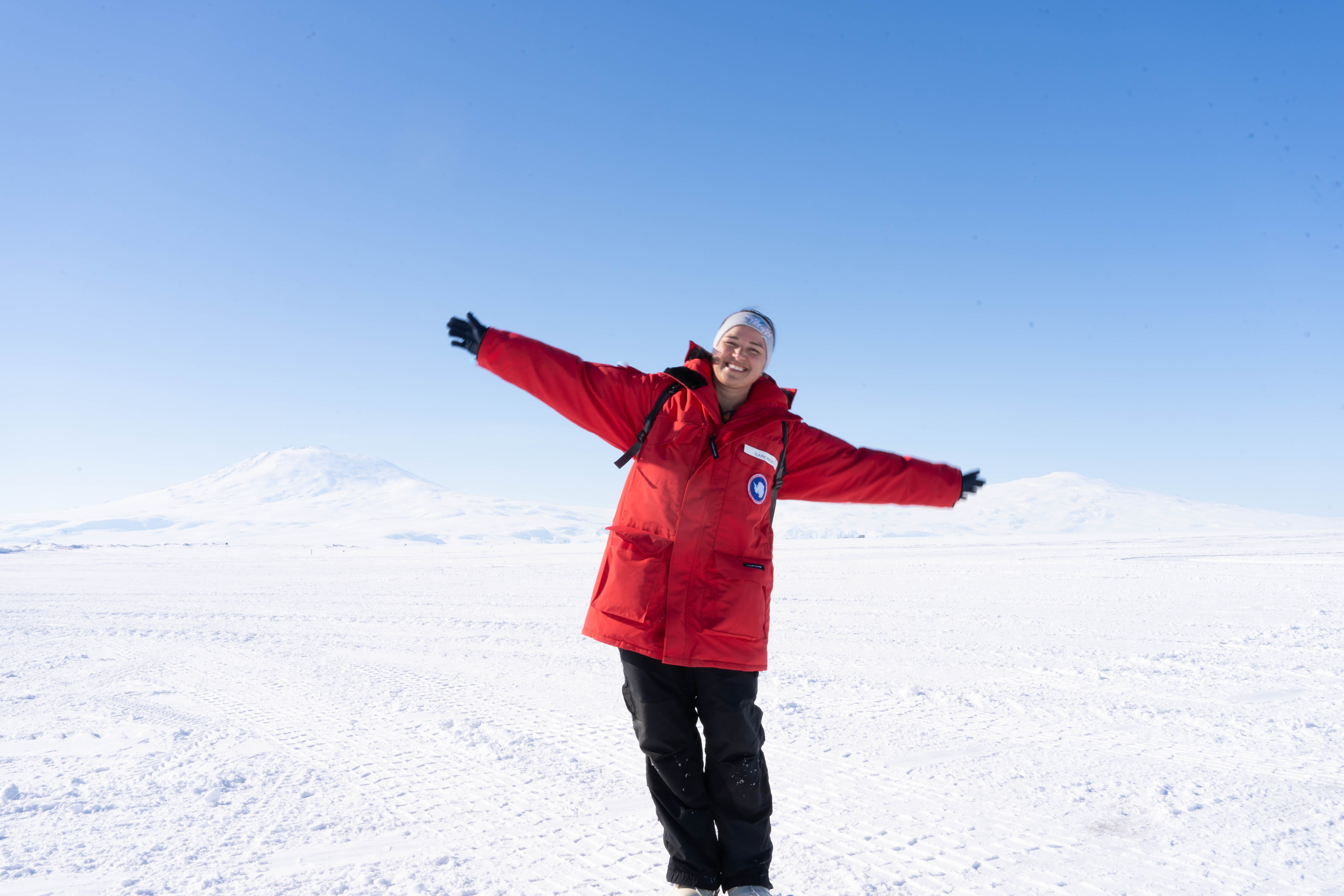 Elaine Krebs stands in front of Mt. Erebus. Williams Field, Antarctica.