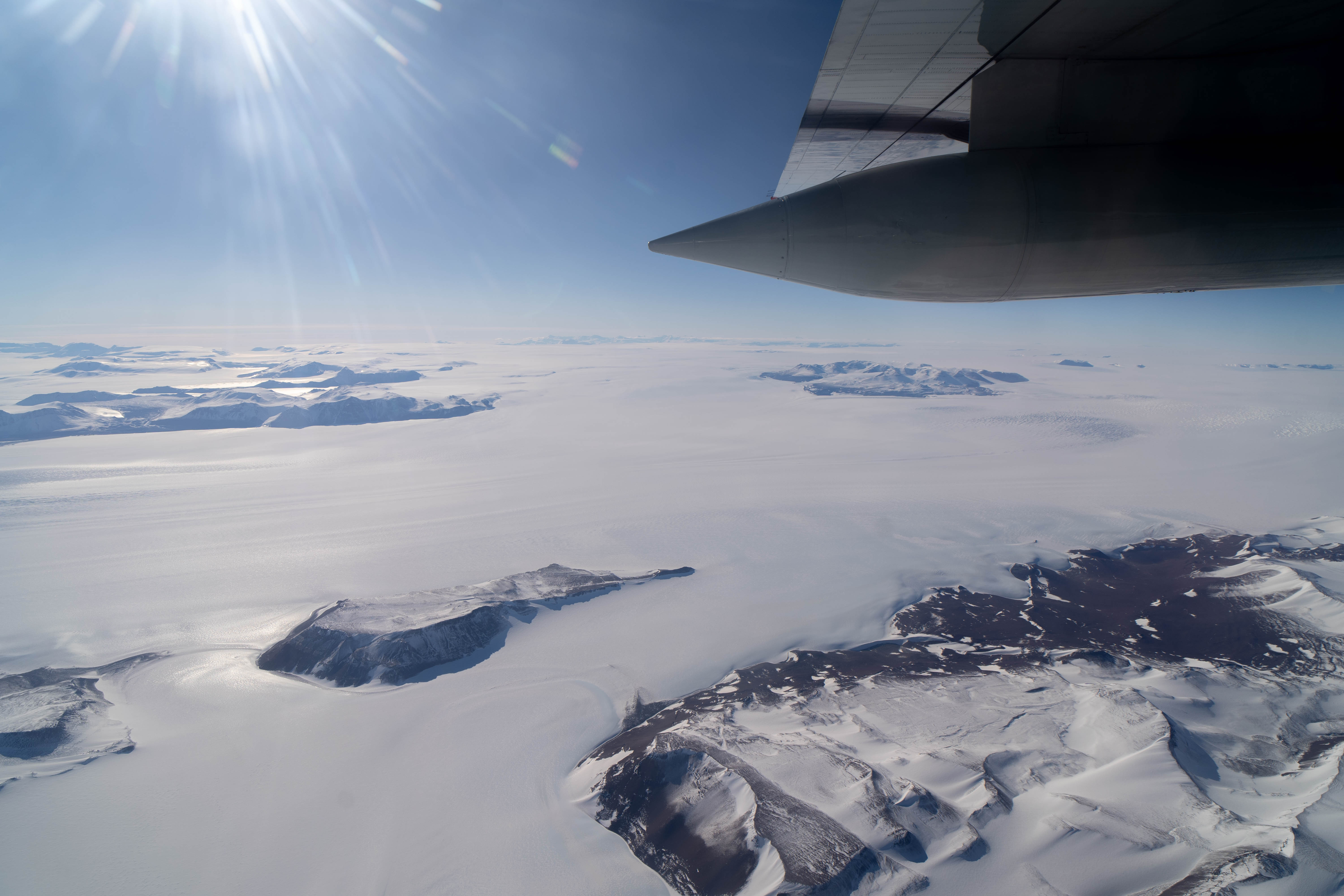 A view of the Trans-Antarctic Mountains from the rear windows of the LC-130 on the flight from McMurdo Station to South Pole Station, Antarctica.
