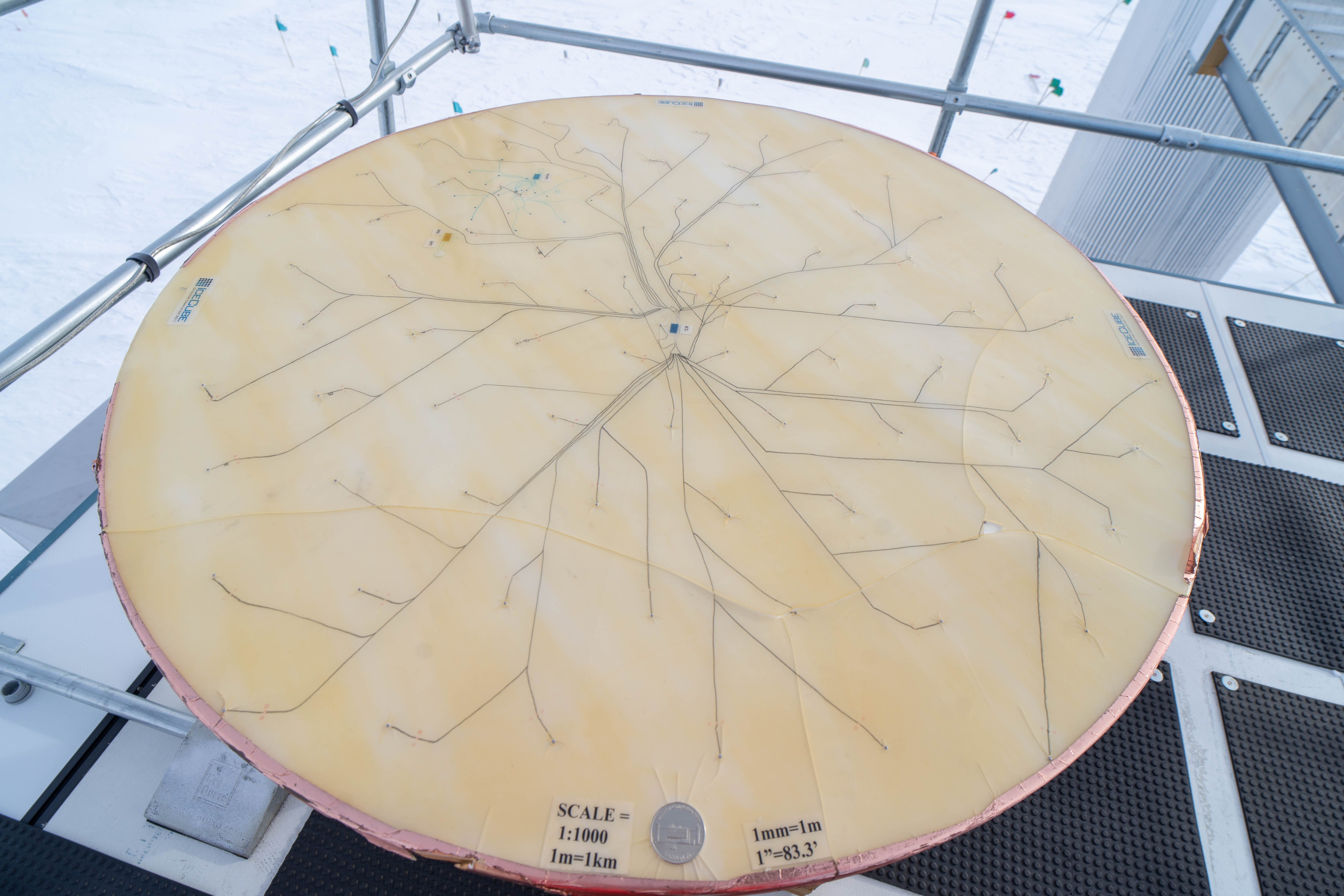A map of the IceCube Neutrino Observatory's DOM (Digital Optical Module) strings that are installed below the ice. Amundsen–Scott South Pole Station, Antarctica.
