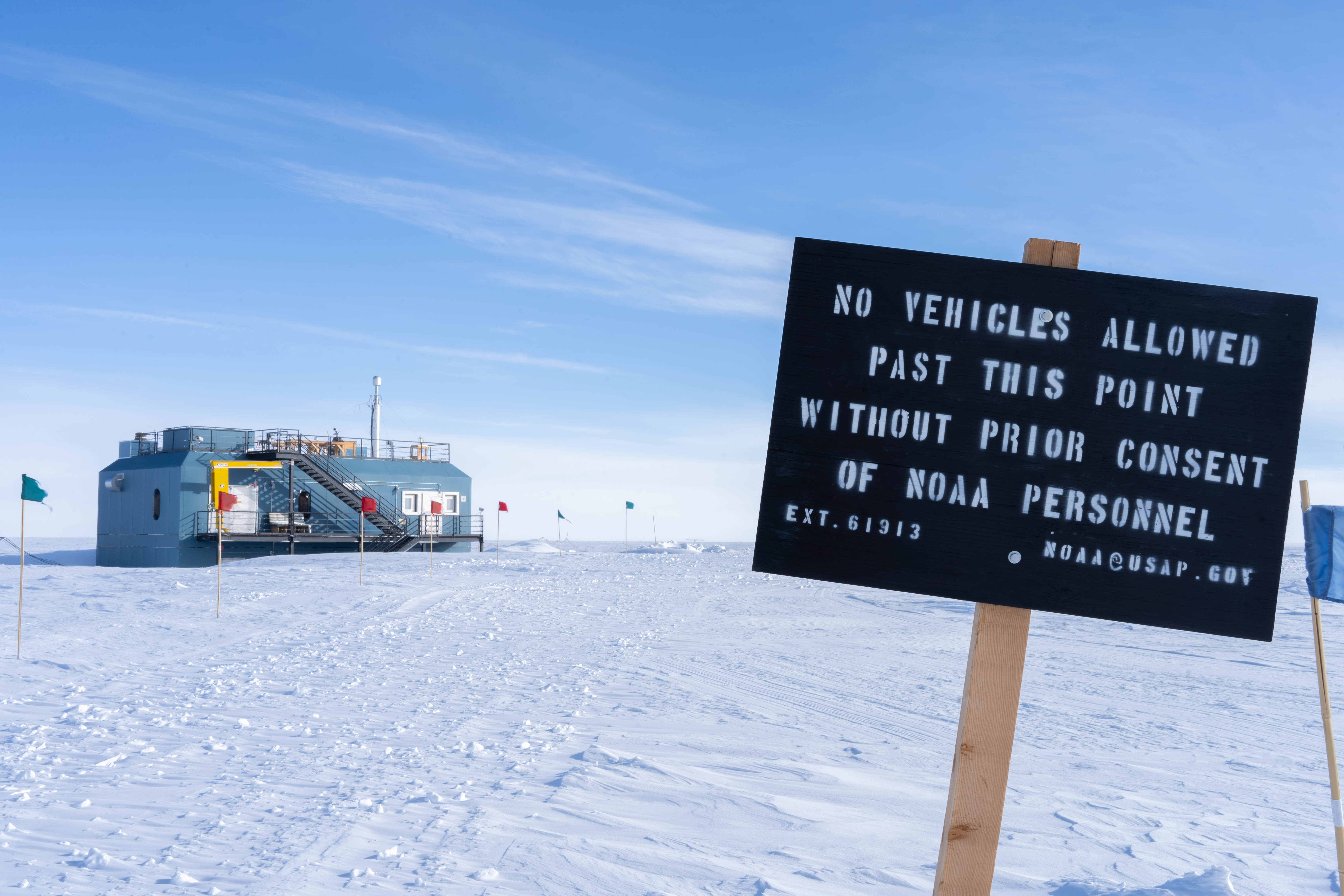 A sign designating the Clean Air Sector with the NOAA Atmospheric Observatory in the background. Amundsen–Scott South Pole Station, Antarctica.