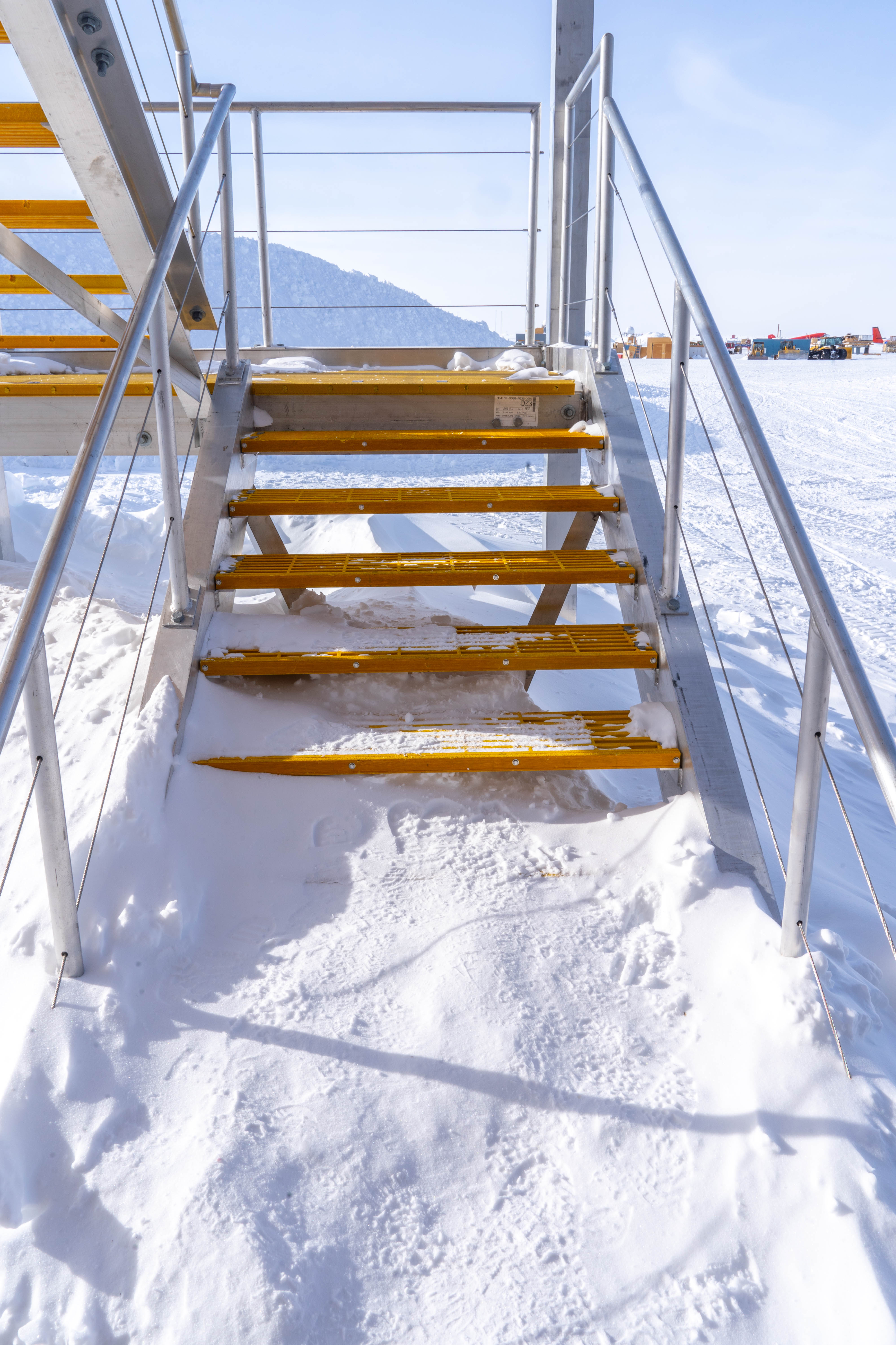 Snow drifts frozen to the staircase on the exterior of the Amundsen–Scott South Pole Station, Antarctica.