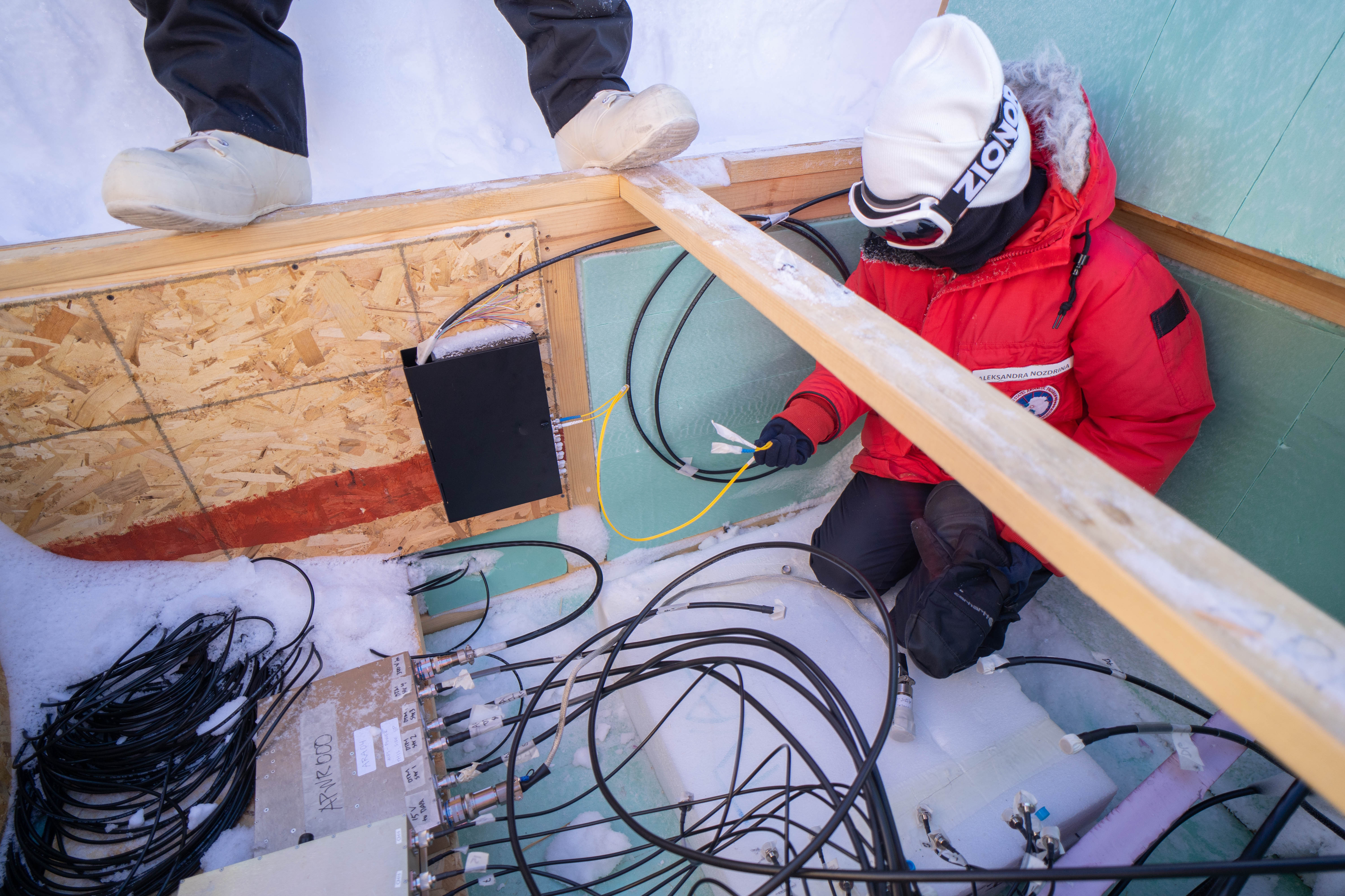A scientist removes cables from the Askaryan Radio Array 4 station. Amundsen–Scott South Pole Station, Antarctica.
