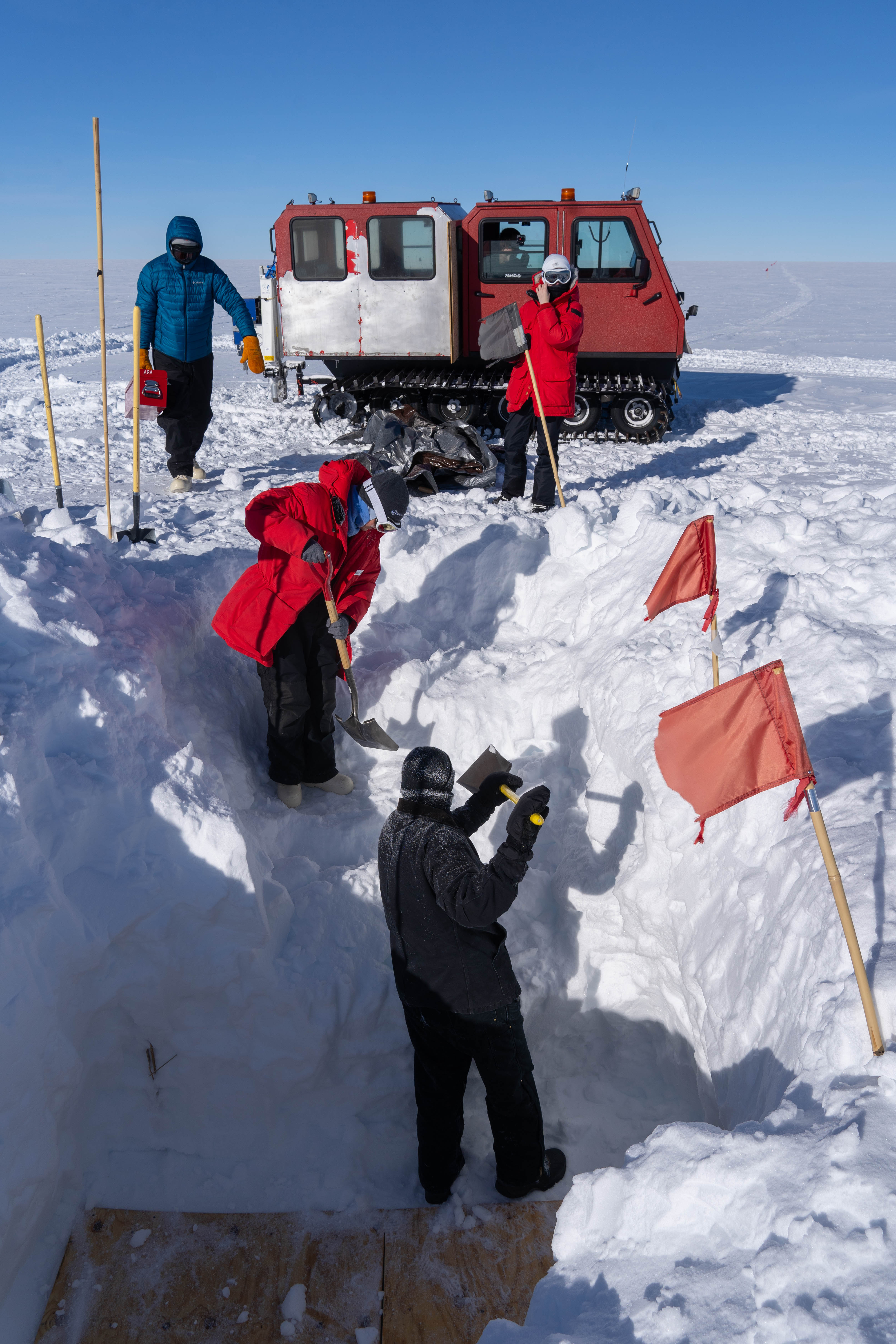 Scientists dig a 15 foot hole down to the Askaryan Radio Array 2 station. Amundsen–Scott South Pole Station, Antarctica.