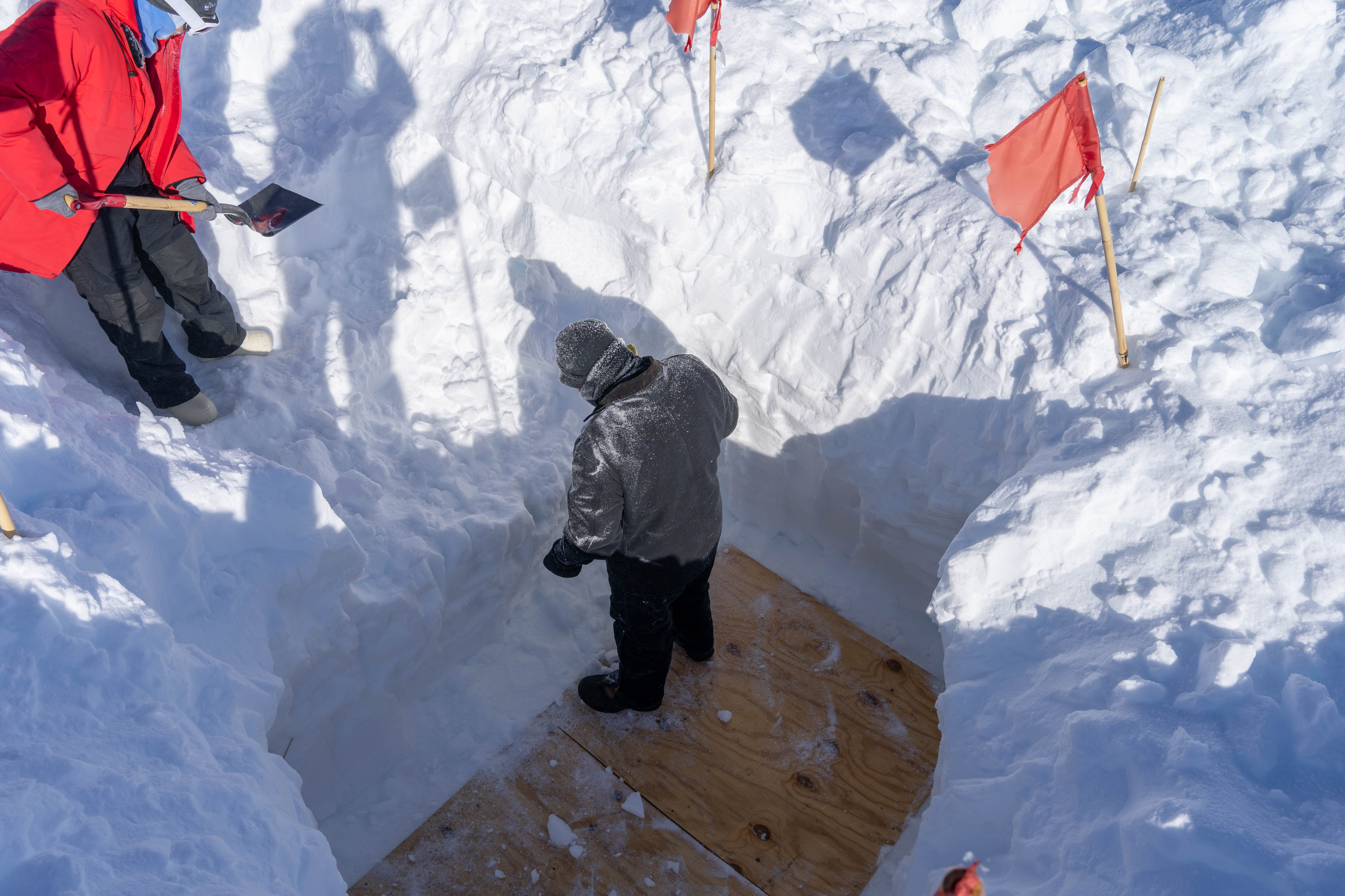 Scientists dig a 15 foot hole down to the Askaryan Radio Array 2 station. Amundsen–Scott South Pole Station, Antarctica.