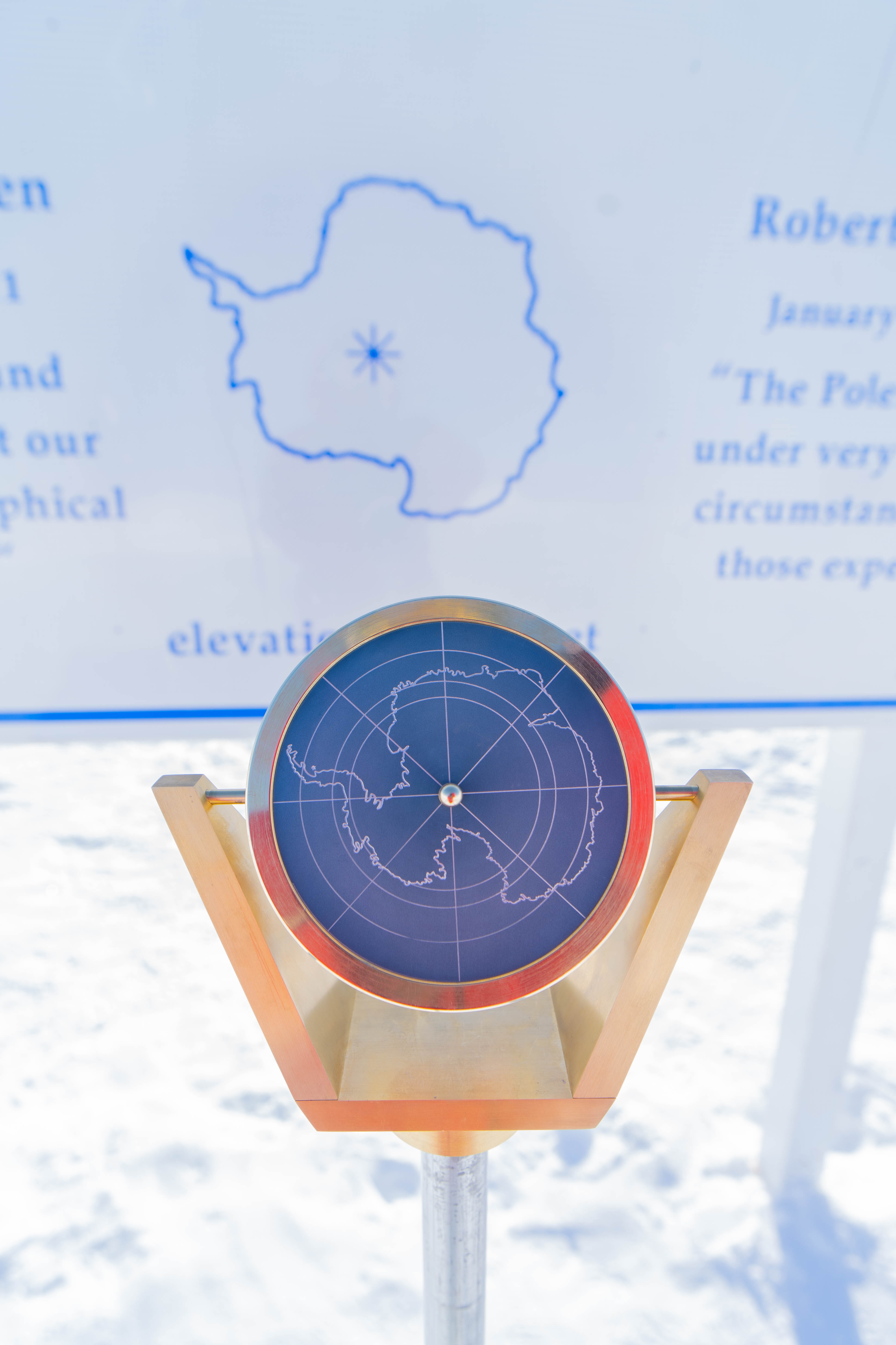 The front of the 2023 Geographic South Pole marker featuring an outline of the continent and a sundial. Amundsen–Scott South Pole Station, Antarctica.