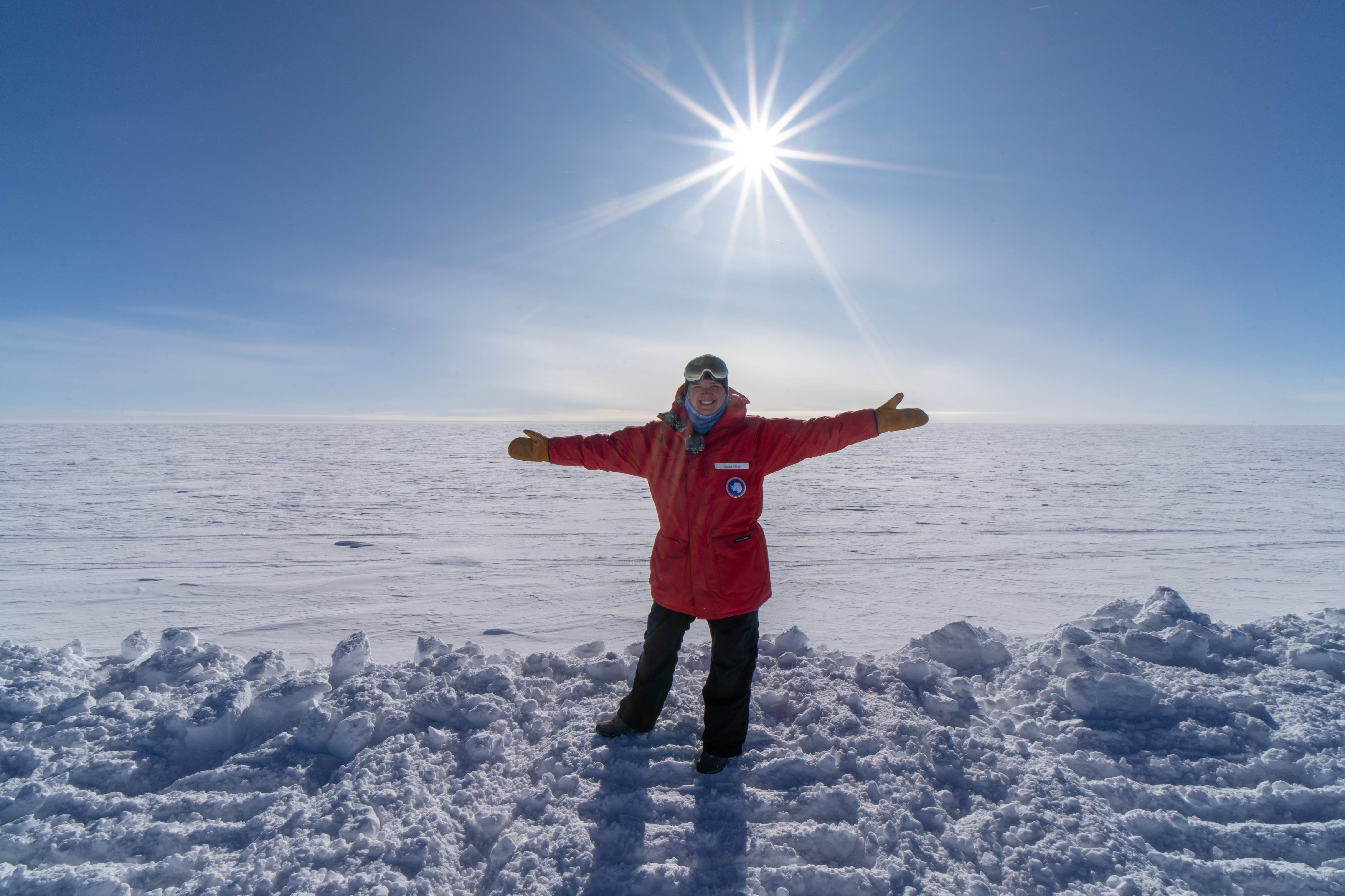 Elaine Krebs stands at the "End of the World" - the very edge of the storage area of the Amundsen–Scott South Pole Station, Antarctica.
