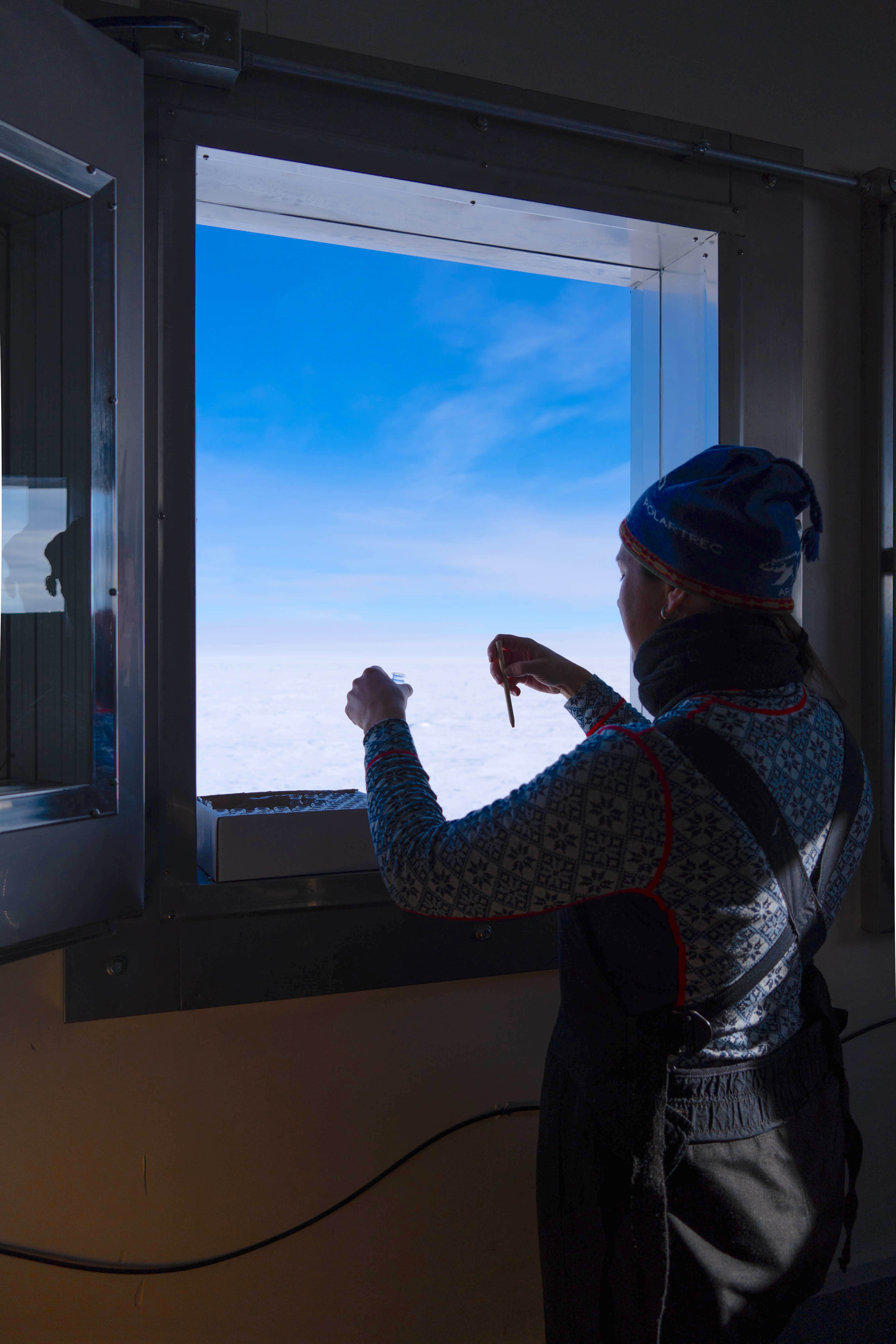 Elaine Krebs collects samples of the clean air at the NOAA Atmospheric Observatory. Amundsen–Scott South Pole Station, Antarctica.