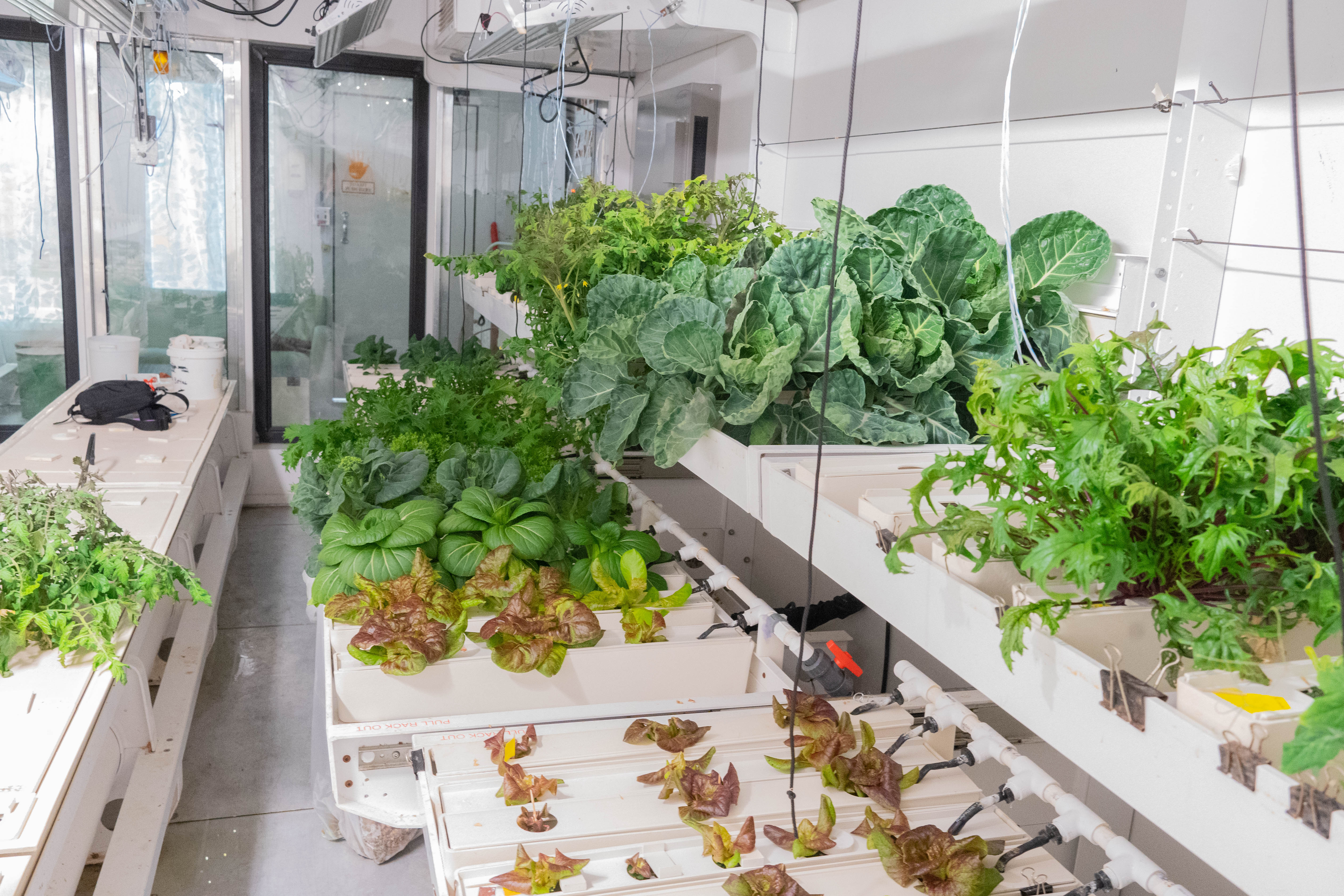 Lettuce and other leafy greens grow inside the South Pole Greenhouse. Amundsen–Scott South Pole Station, Antarctica.