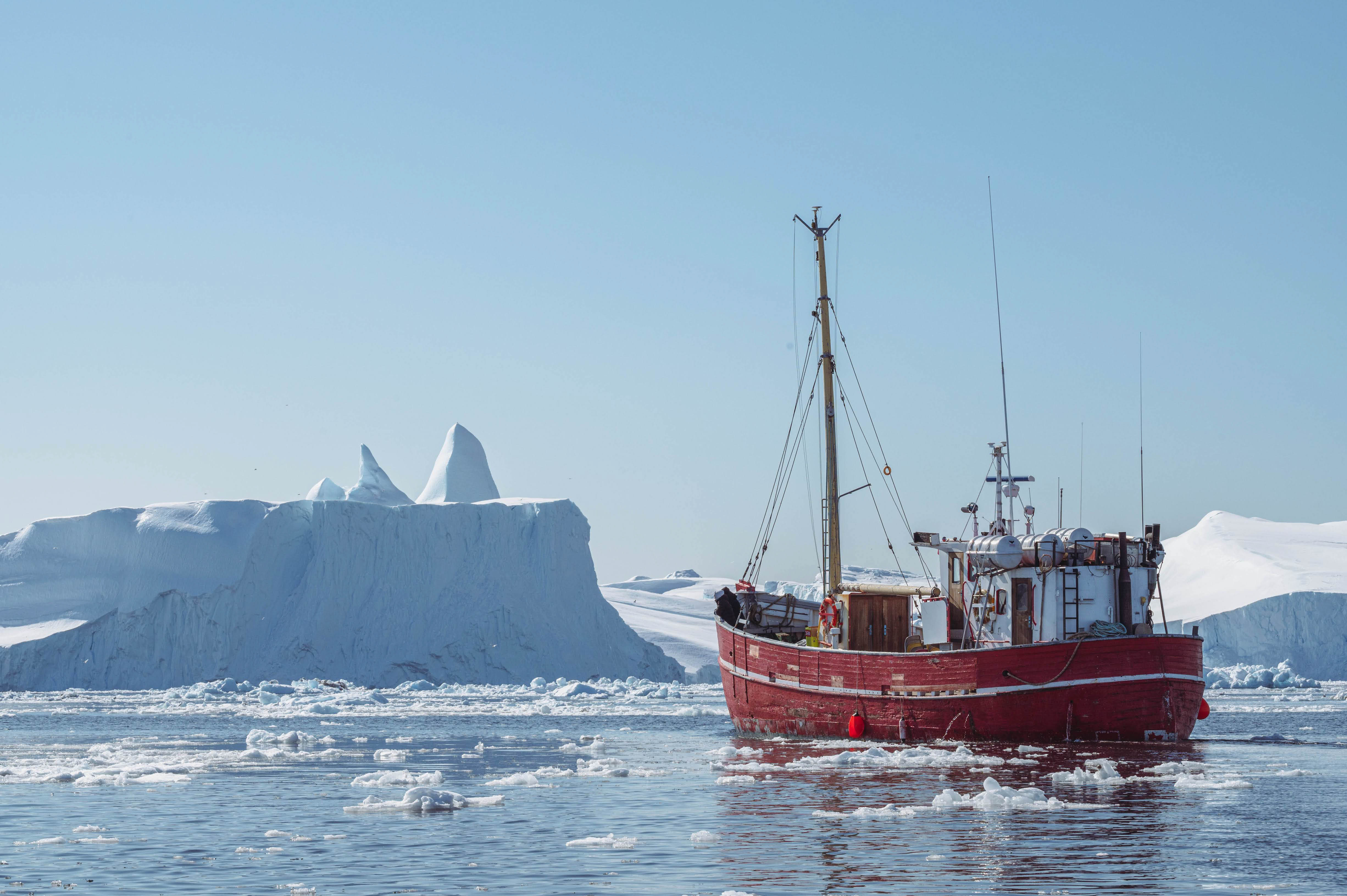 A boat brings tourists out for rides that wind through icebergs. Ilulissat, Greenland.