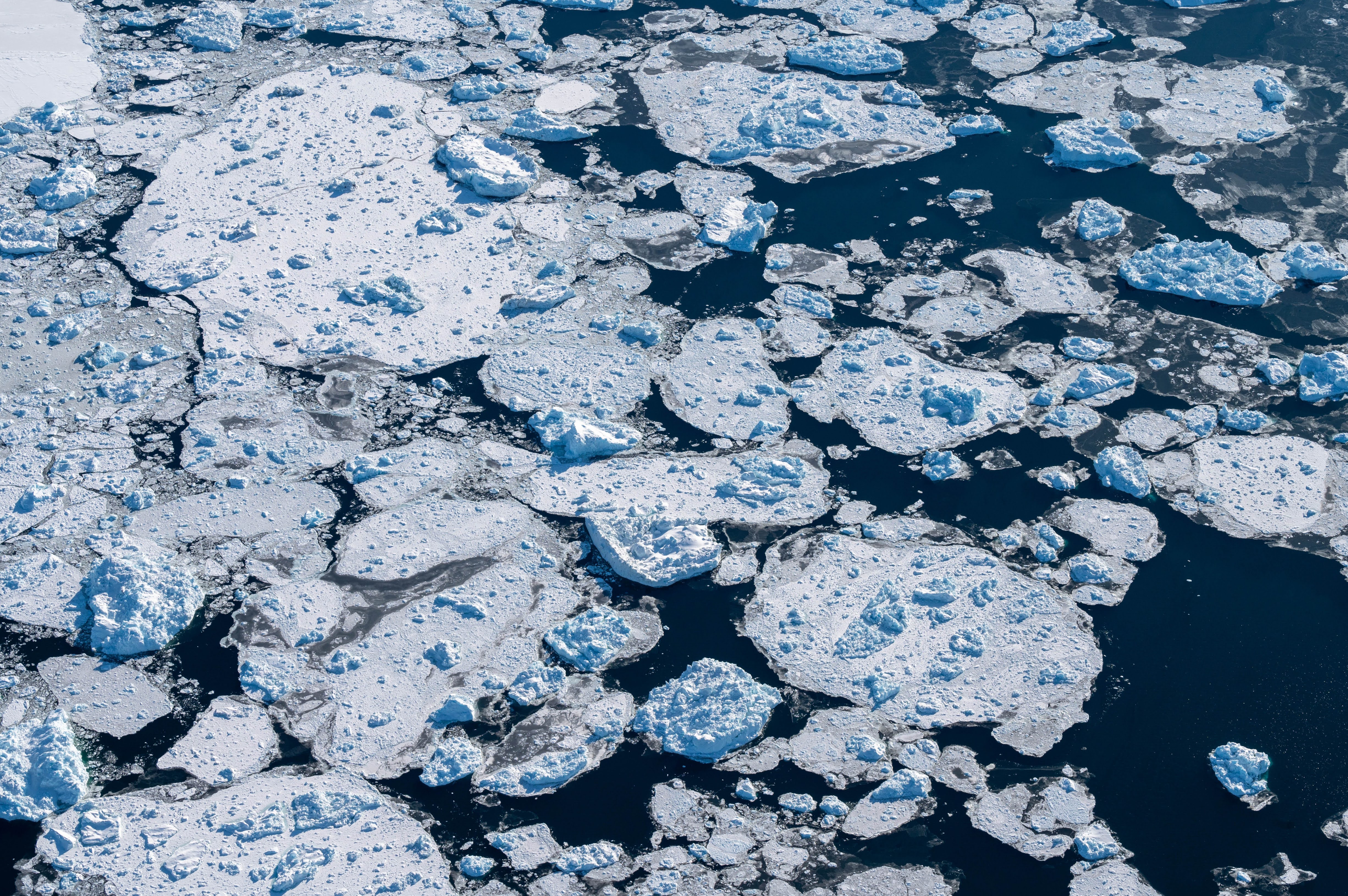 A aerial helicopter view of icebergs trapped in sea ice. Ilulissat, Greenland.