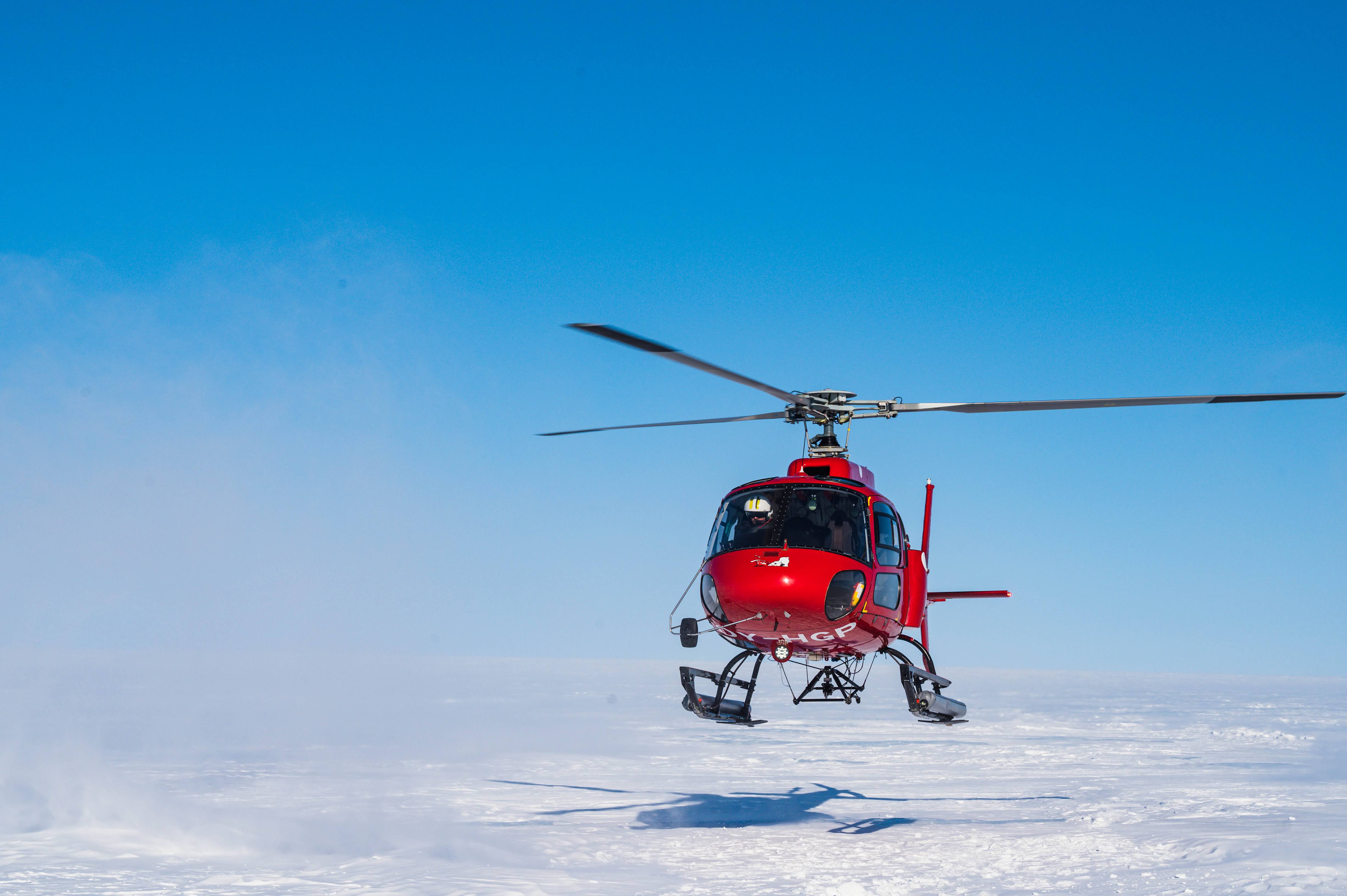 Greenland’s red colored helicopters drop off teams on the Greenland Ice Sheet and fly to next location to pick up more gear.