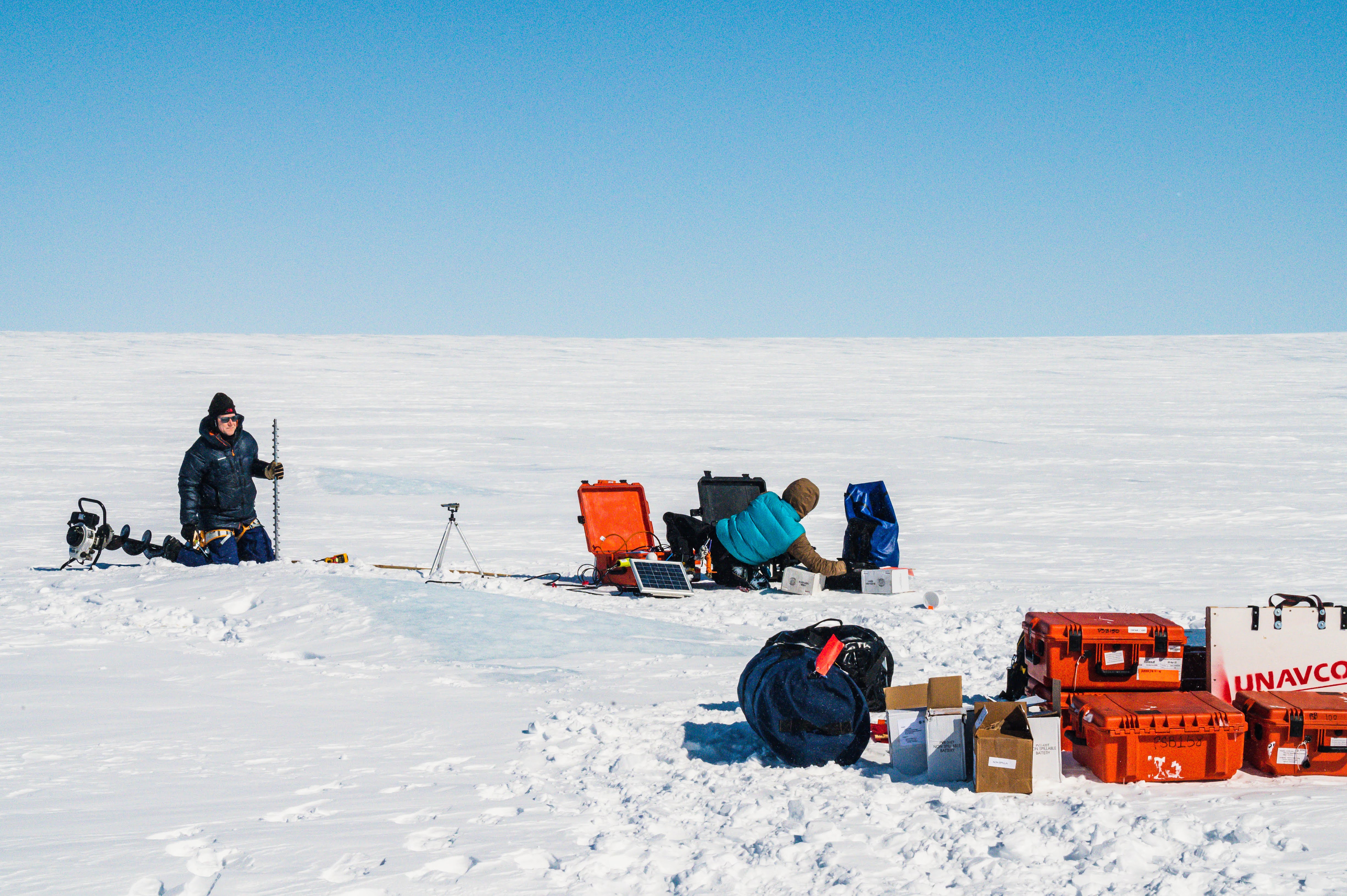 Members of the Greenland Subglacial Tremor Project team set up equipment on the ice of the western Greenland Ice Sheet.