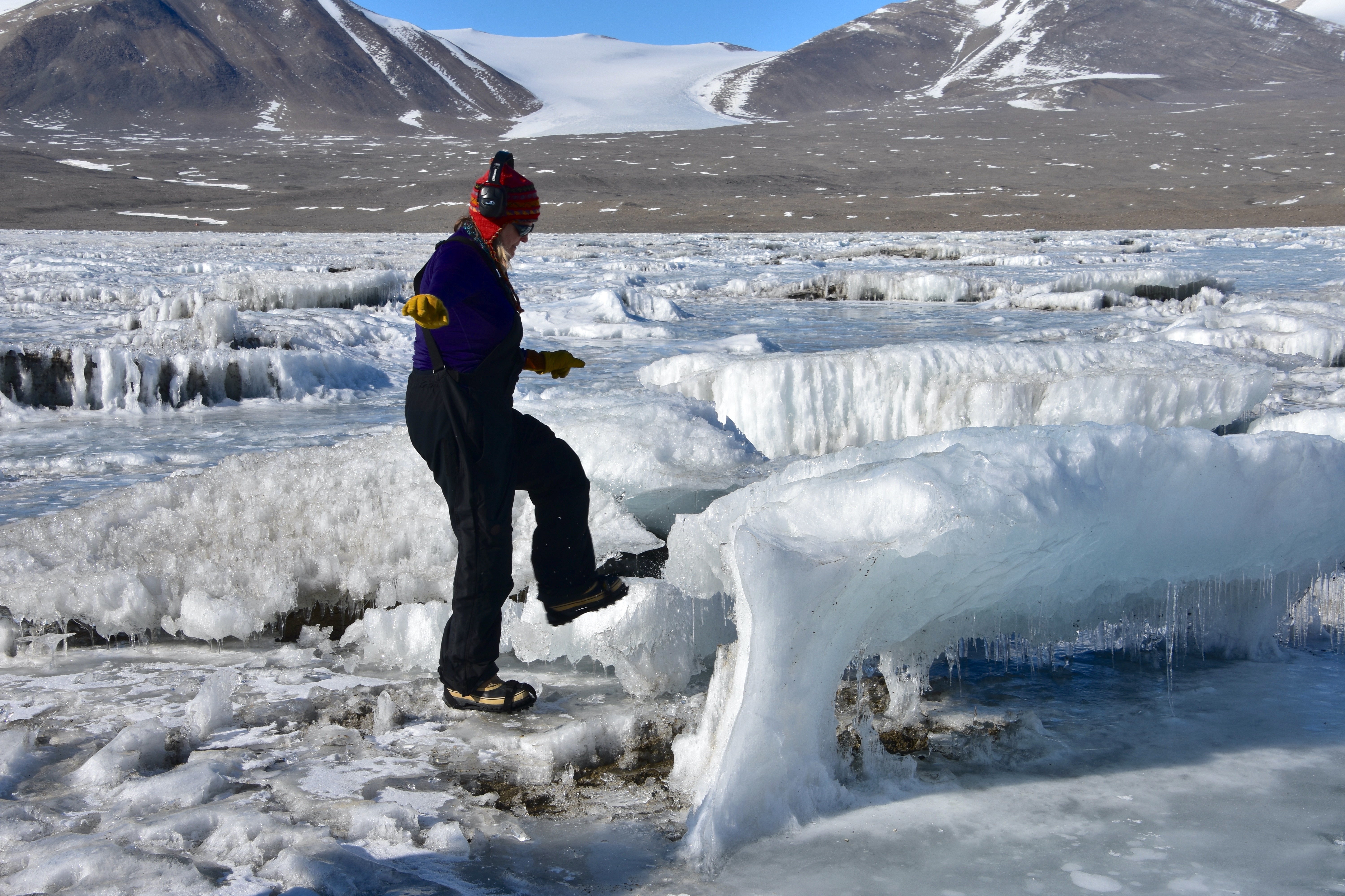 Lucy Coleman plays with the ice shapes on Lake Fryxell, McMurdo Dry Valleys, Antarctica.
