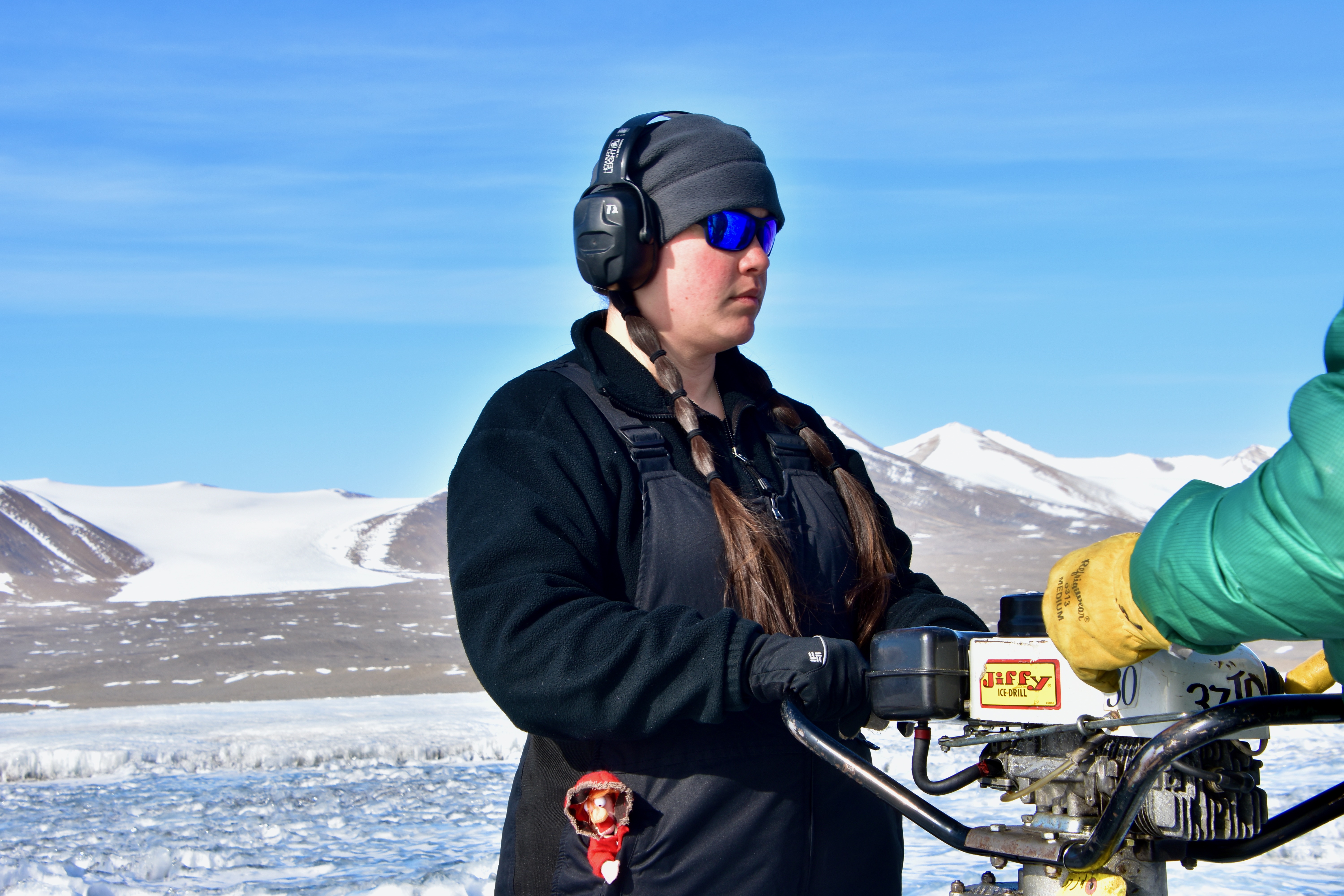 Kodi Haughn uses the jiffy drill on Lake Fryxell. McMurdo Dry Valleys, Antarctica.