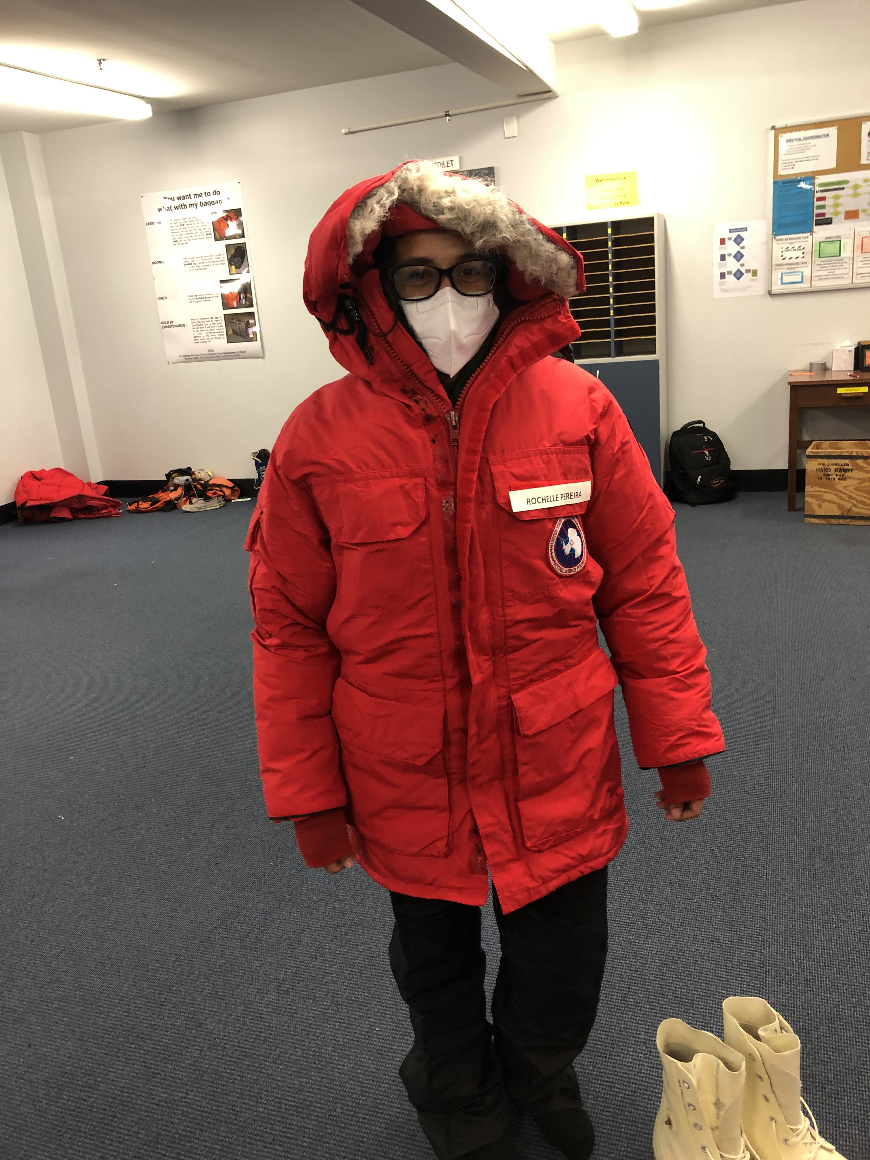 Scientist Rochelle Periera tries on her Extreme Cold Weather (ECW) gear at the Clothing Distribution Center in Christchurch, New Zealand.
