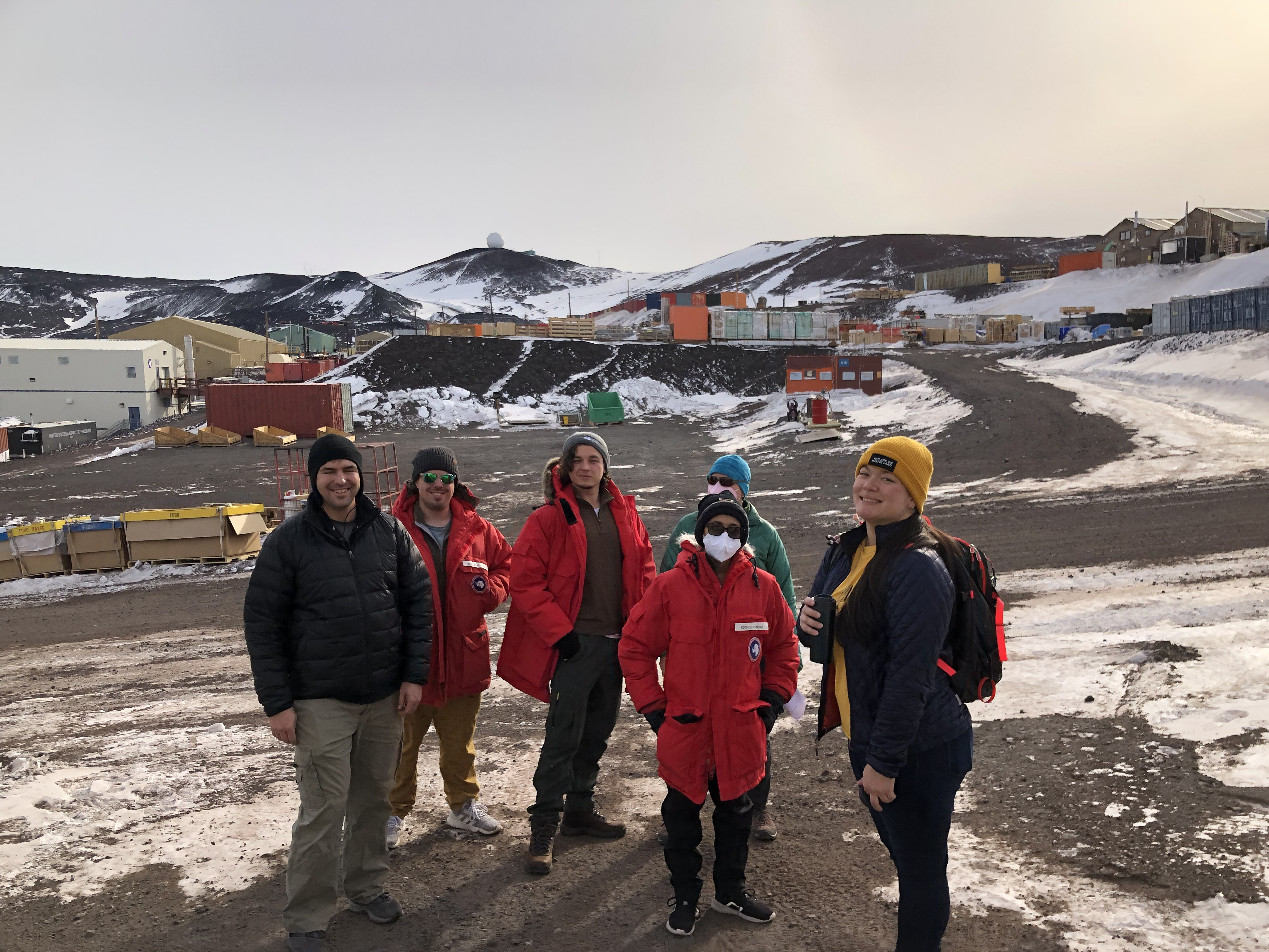 Brandon Briggs, Brad Krzysiak, Eckhardt Karsten, Rochelle Periera, Rachael Morgan-Kiss, and Kodi Haughn arrive at McMurdo Station, Antarctica.