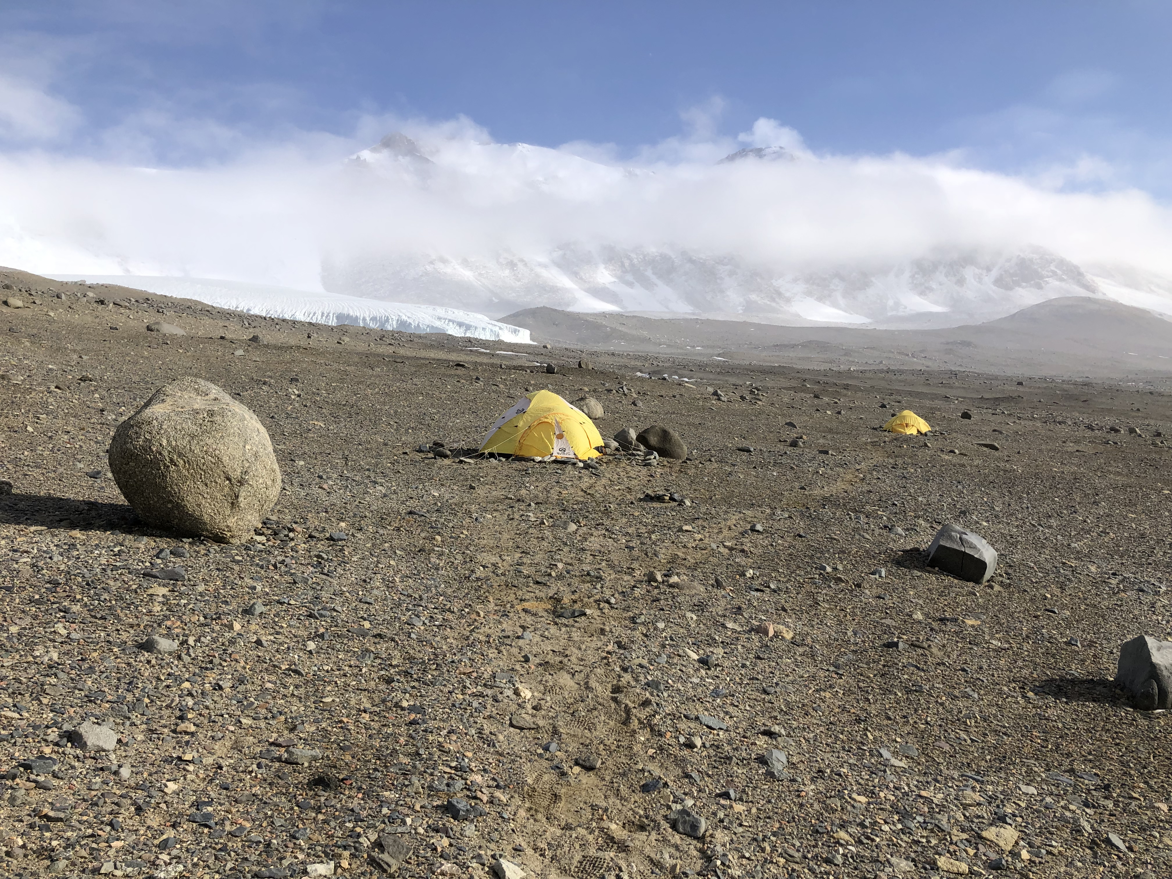 Tents are set up near Lake Bonney, McMurdo Dry Valleys, Antarctica.