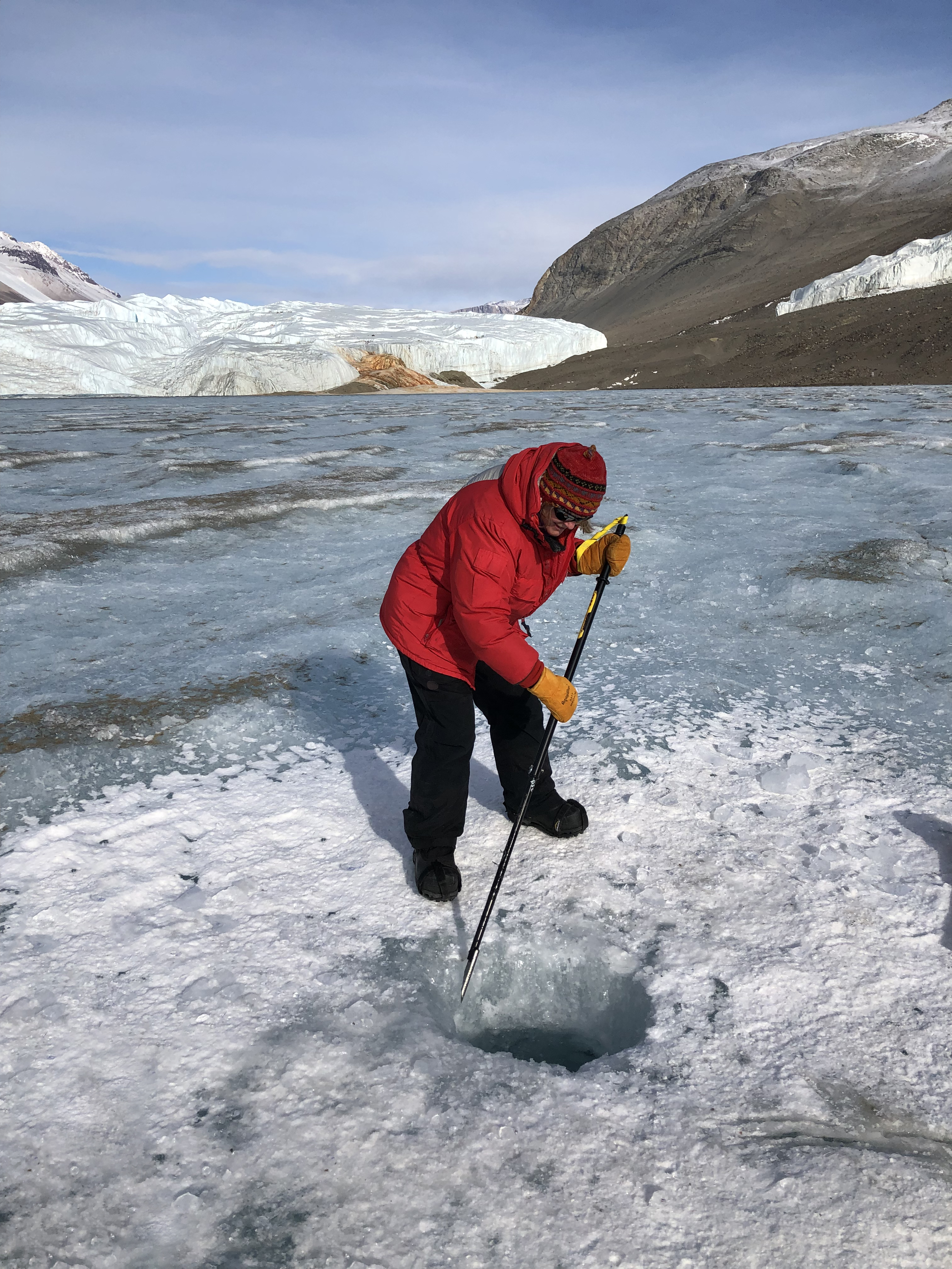 Lucy Coleman chips away at ice at the drill hole on Lake Bonney, McMurdo Dry Valleys, Antarctica.