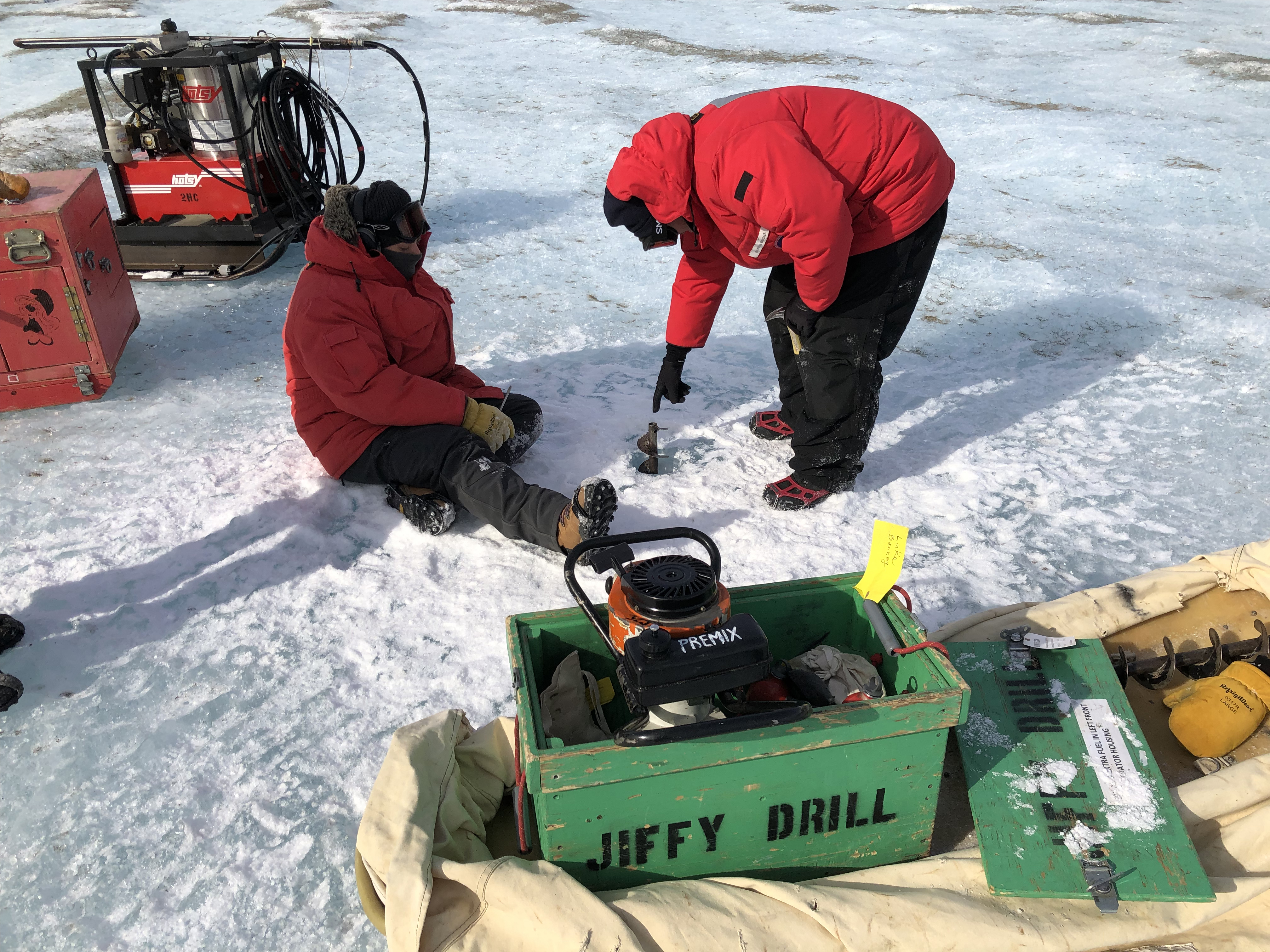 Scientists troubleshoot a drill that has become stuck in the lake ice. Lake Bonney, McMurdo Dry Valleys, Antarctica.