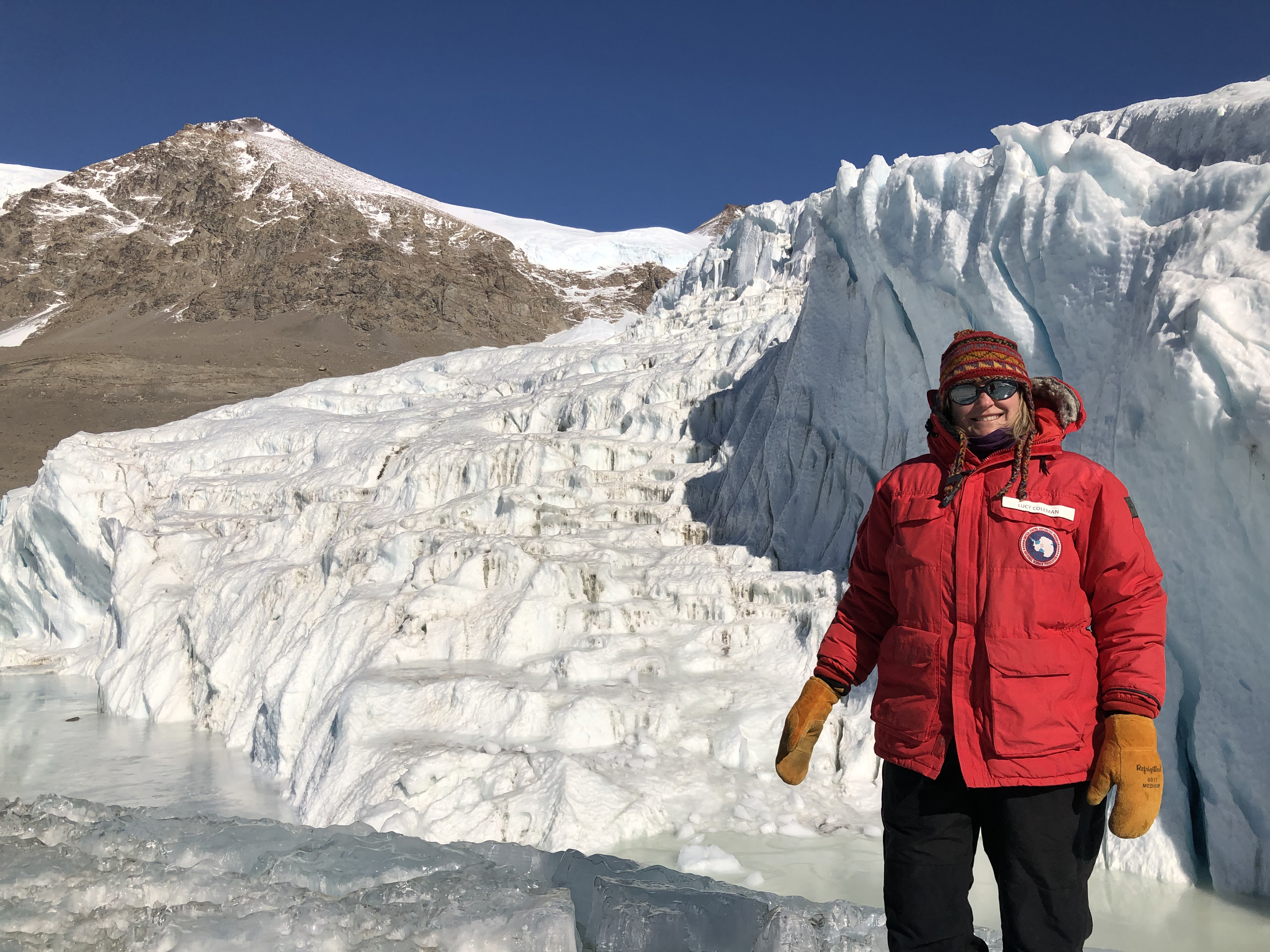 Lucy stands on the frozen Lake Bonney where it meets Taylor Glacier. McMurdo Dry Valleys, Antarctica.