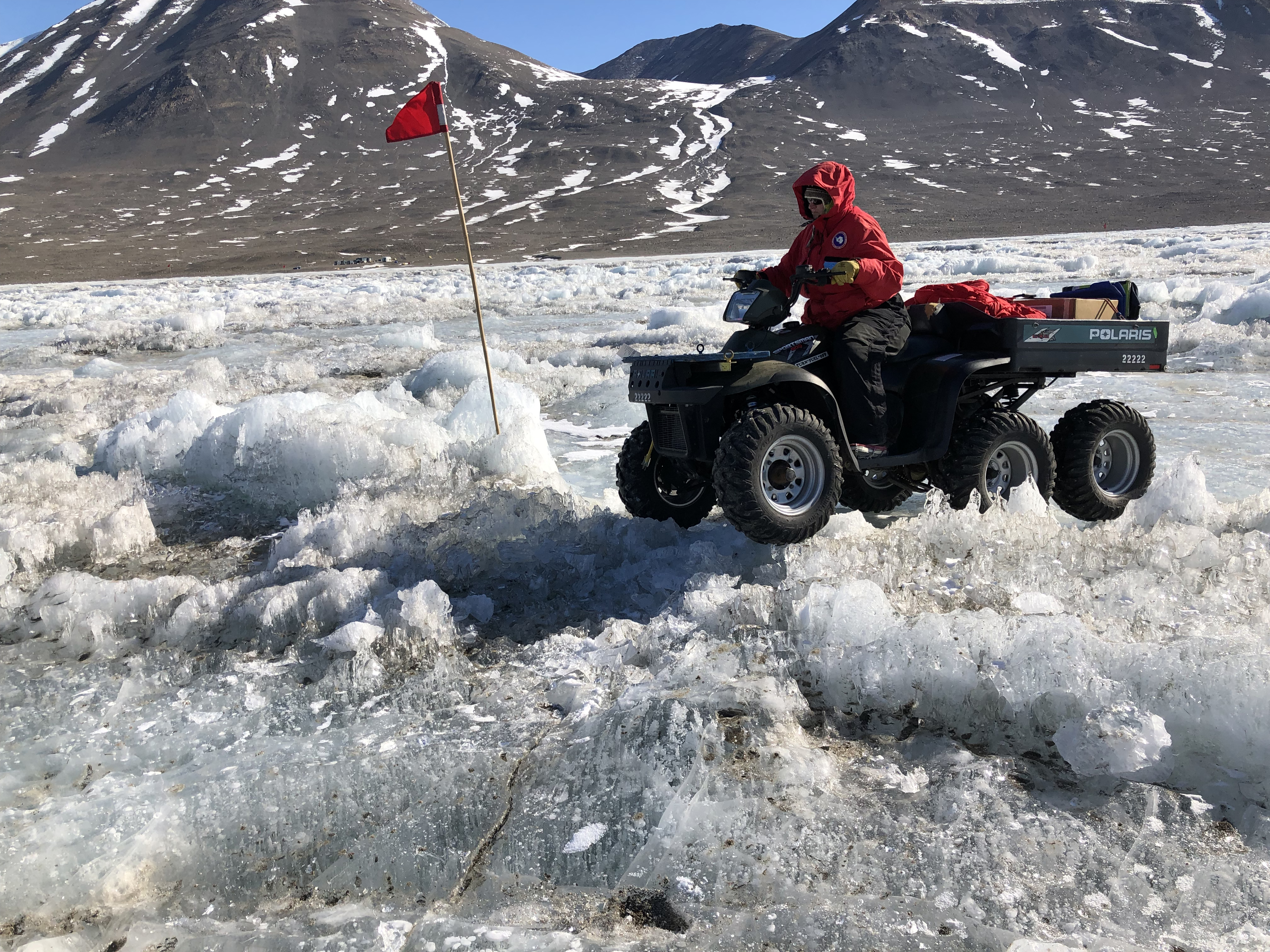 Dr. Rachael Morgan-Kiss makes her way over Lake Fryxell on an ATV. McMurdo Dry Valleys, Antarctica.