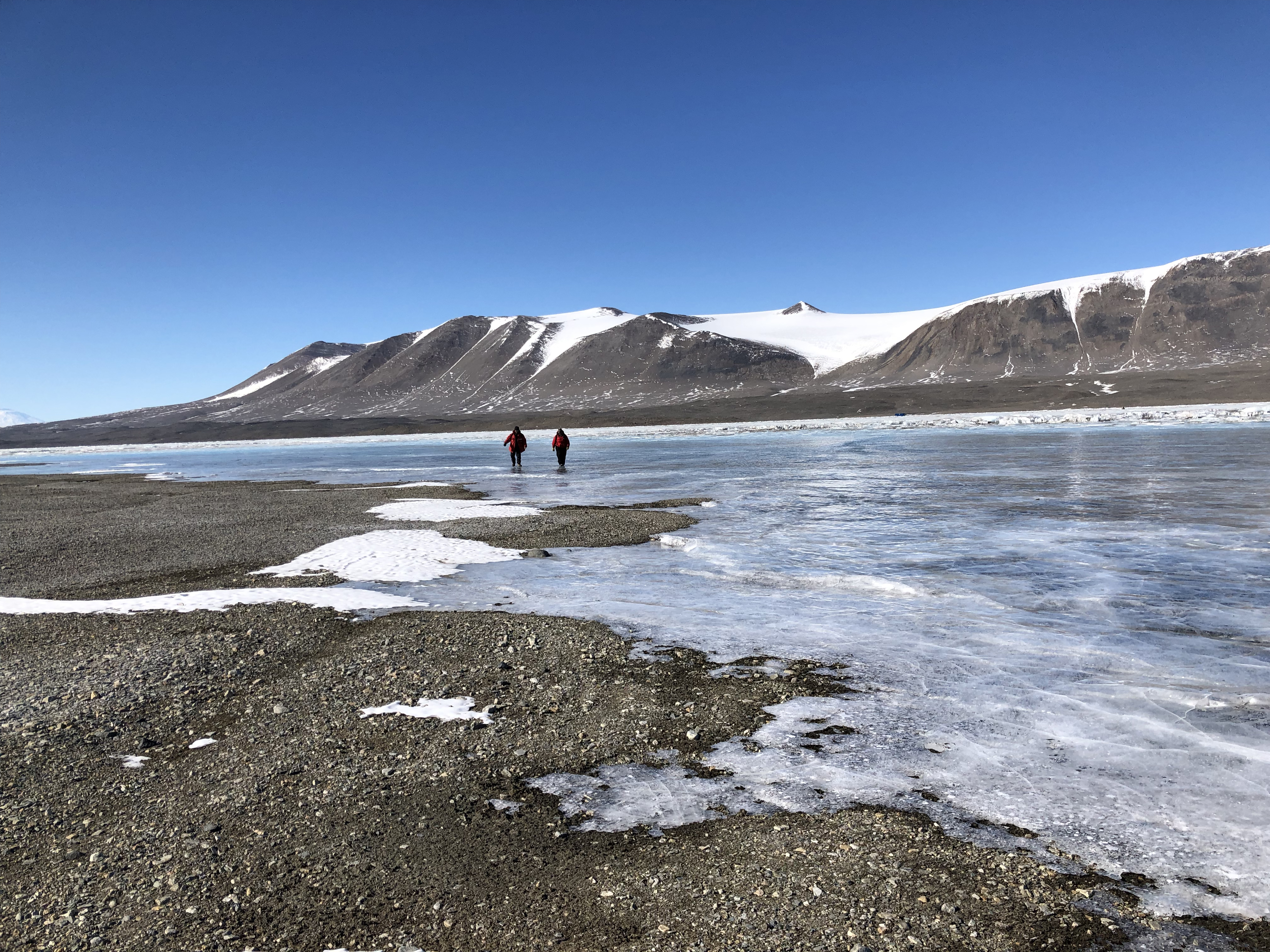 Researchers walk on the smooth "moat" ice on the edge of Lake Fryxell. McMurdo Dry Valleys, Antarctica.