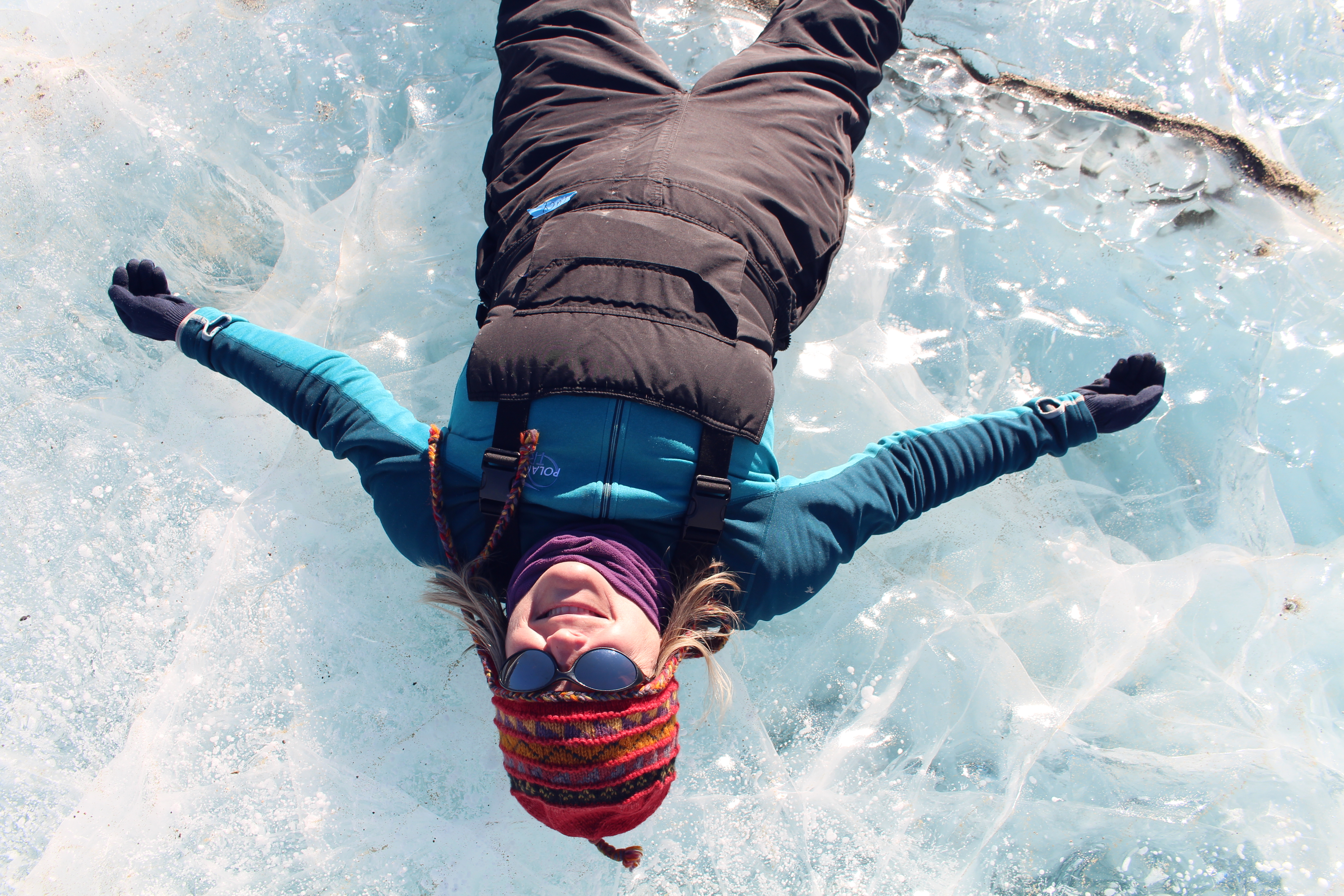 Lucy Coleman lays on the frozen surface of Lake Bonney. McMurdo Dry Valleys, Antarctica.
